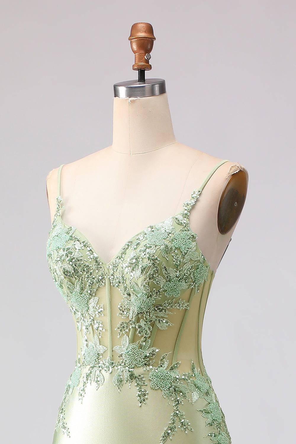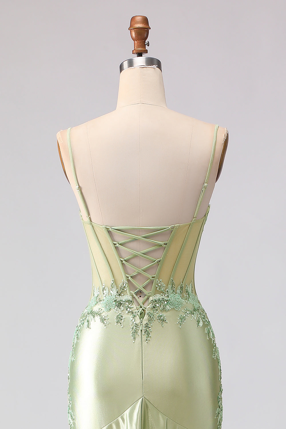 Ljusgrön Sjöjungfru Broderad Korsett Volang Lång Balklänning med Snöre På Ryggen