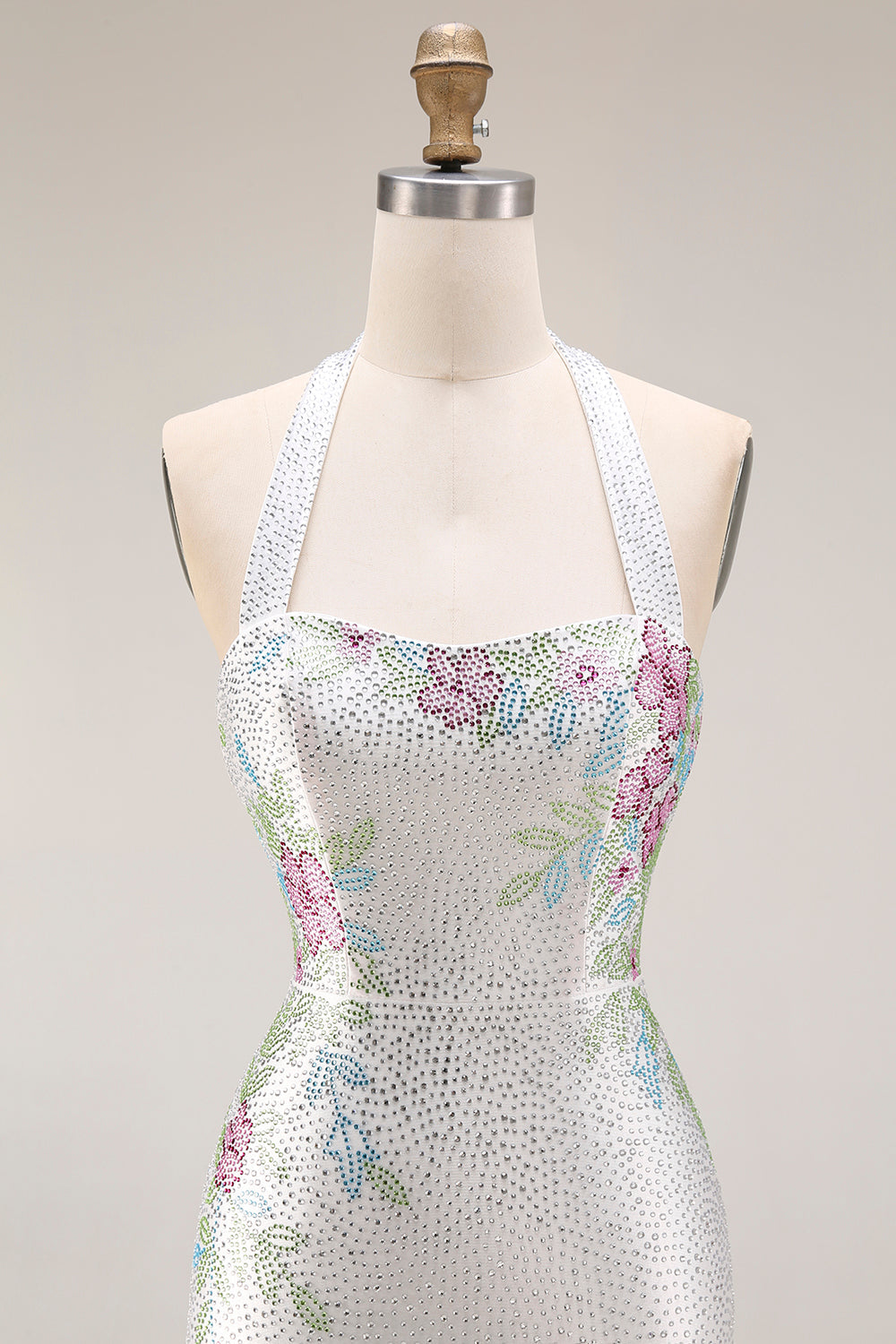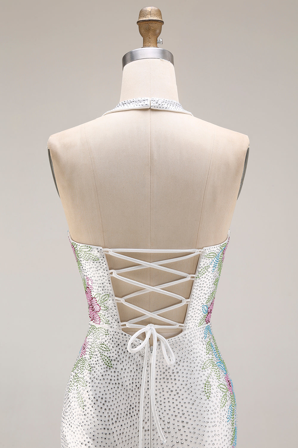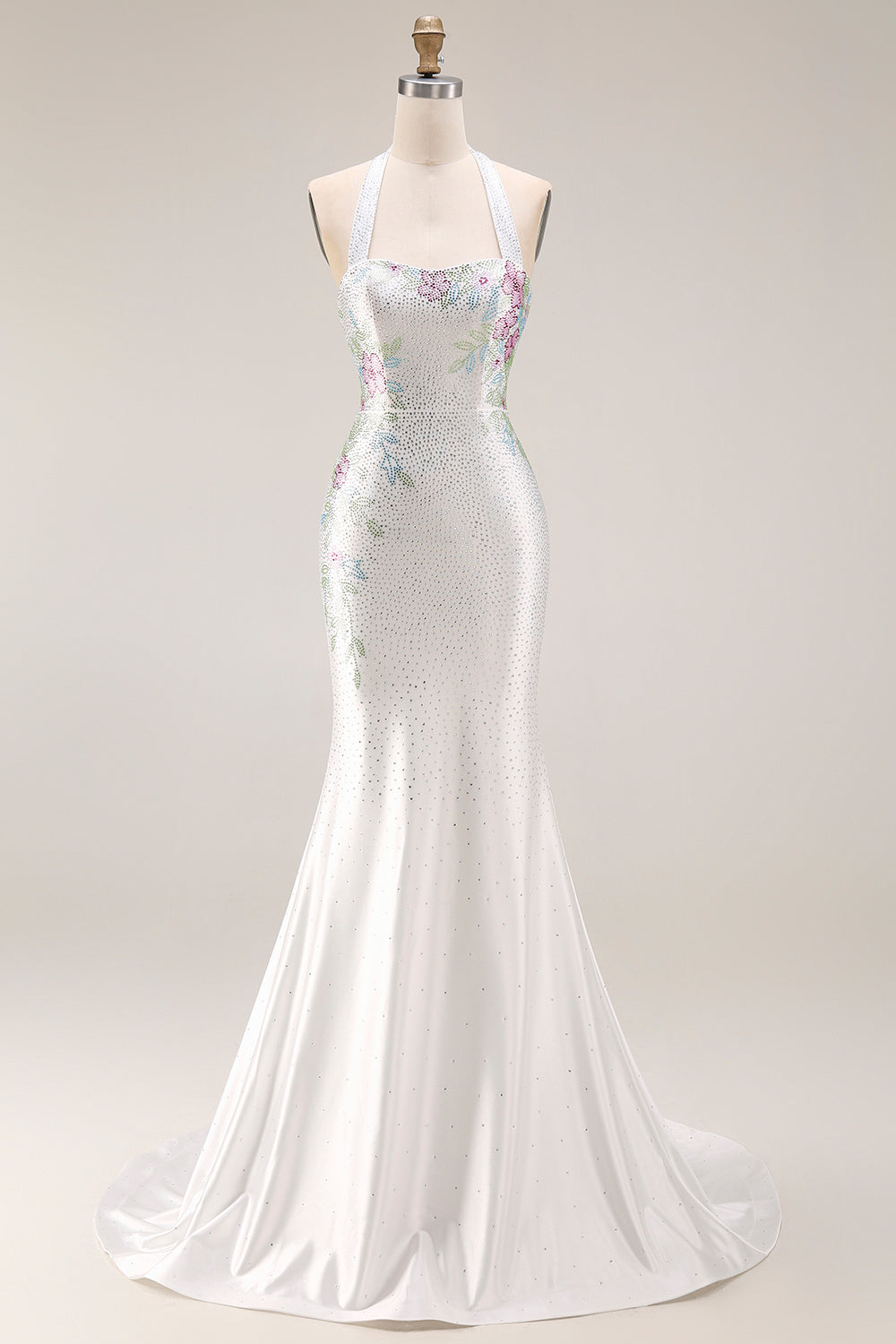 Vit pärlprydd halter sjöjungfru satinkläkt lång balklänning