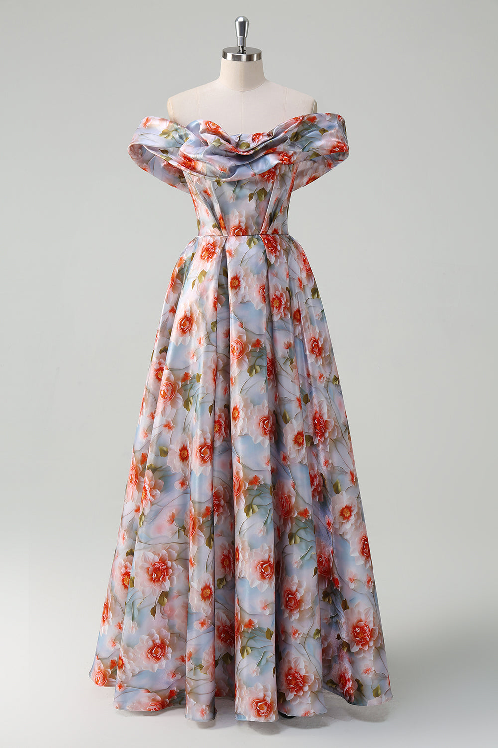 Blå, Röd, Blomma, En Linje Från Axeln Rynkad Lång Balklänning