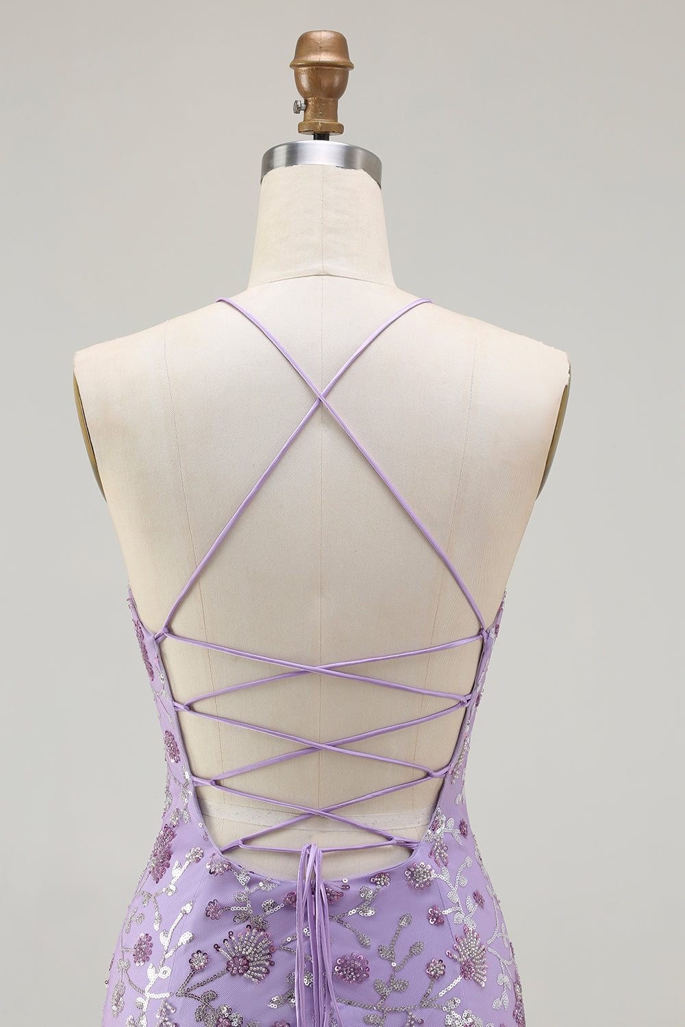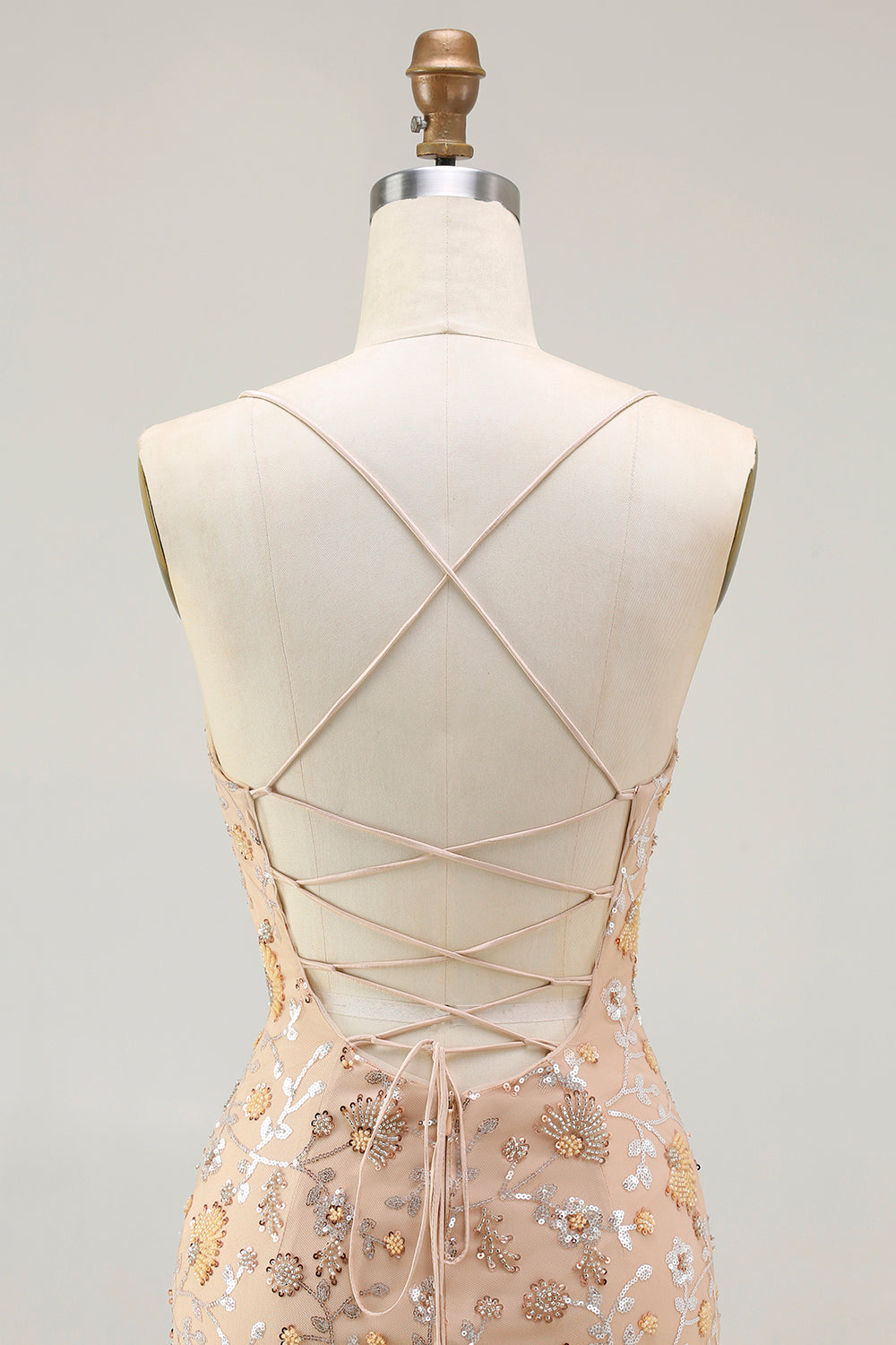 Champagnepärlad sjöjungfru paljett, spetsad bakre lång balklänning med slits