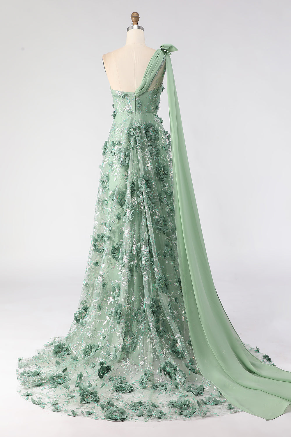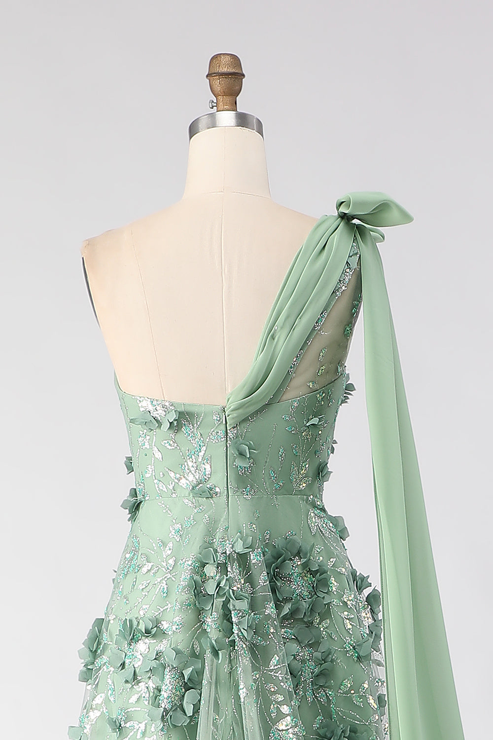 Eukalyptusklänning med en axel A-linje paljetter 3D blommor lång balklänning med slits