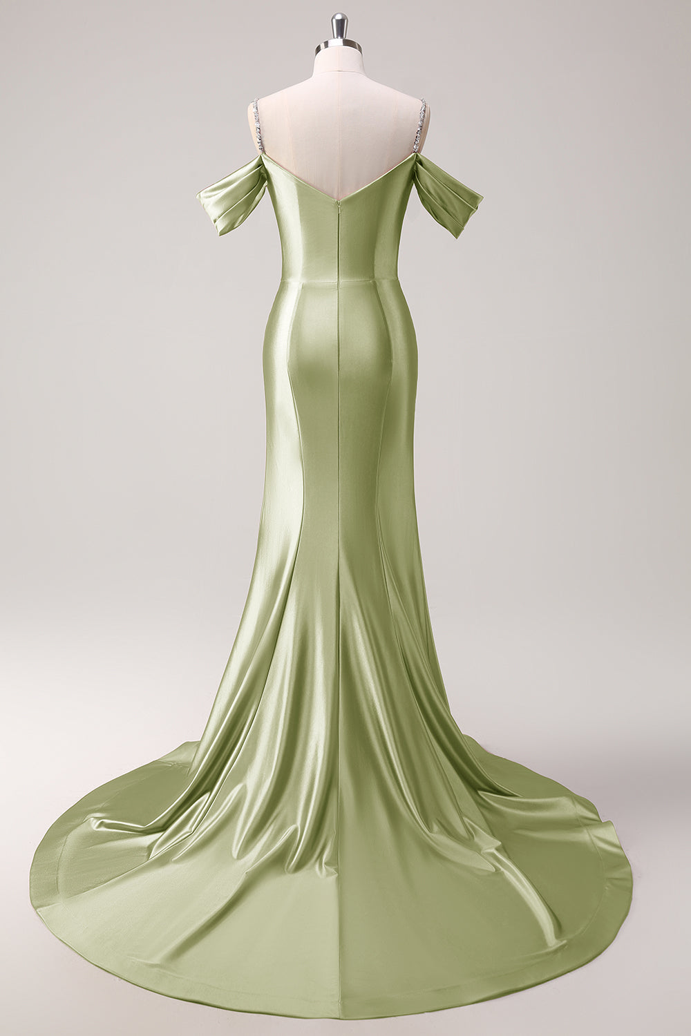 Glittrande Grå Grön Sjöjungfru Axelbandslös Korsett Appliques Satin Lång Prom Klänning Med Slits