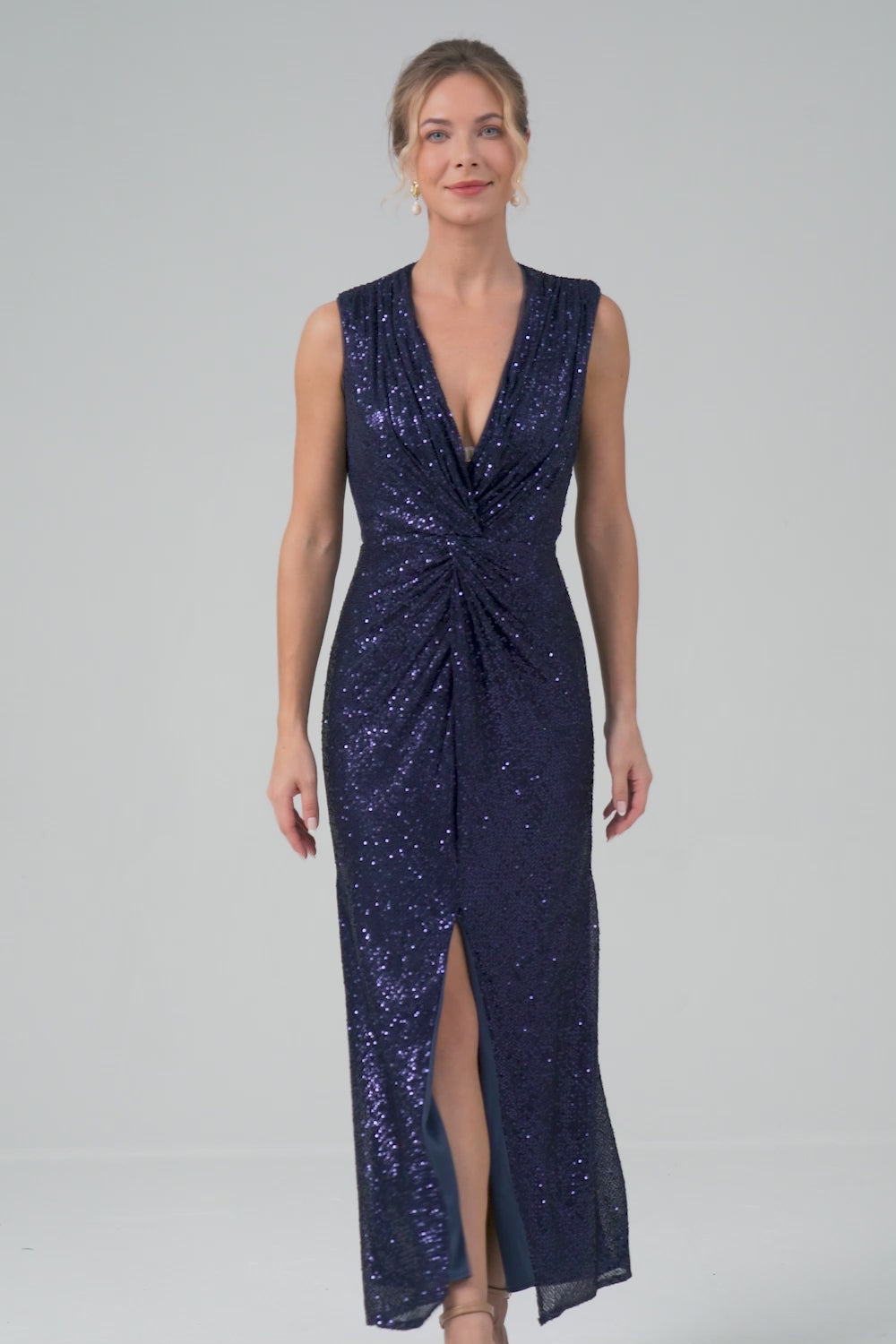 Glittrande Marinblå Slida V-ringad Paljetter Telängd Balklänning med slits