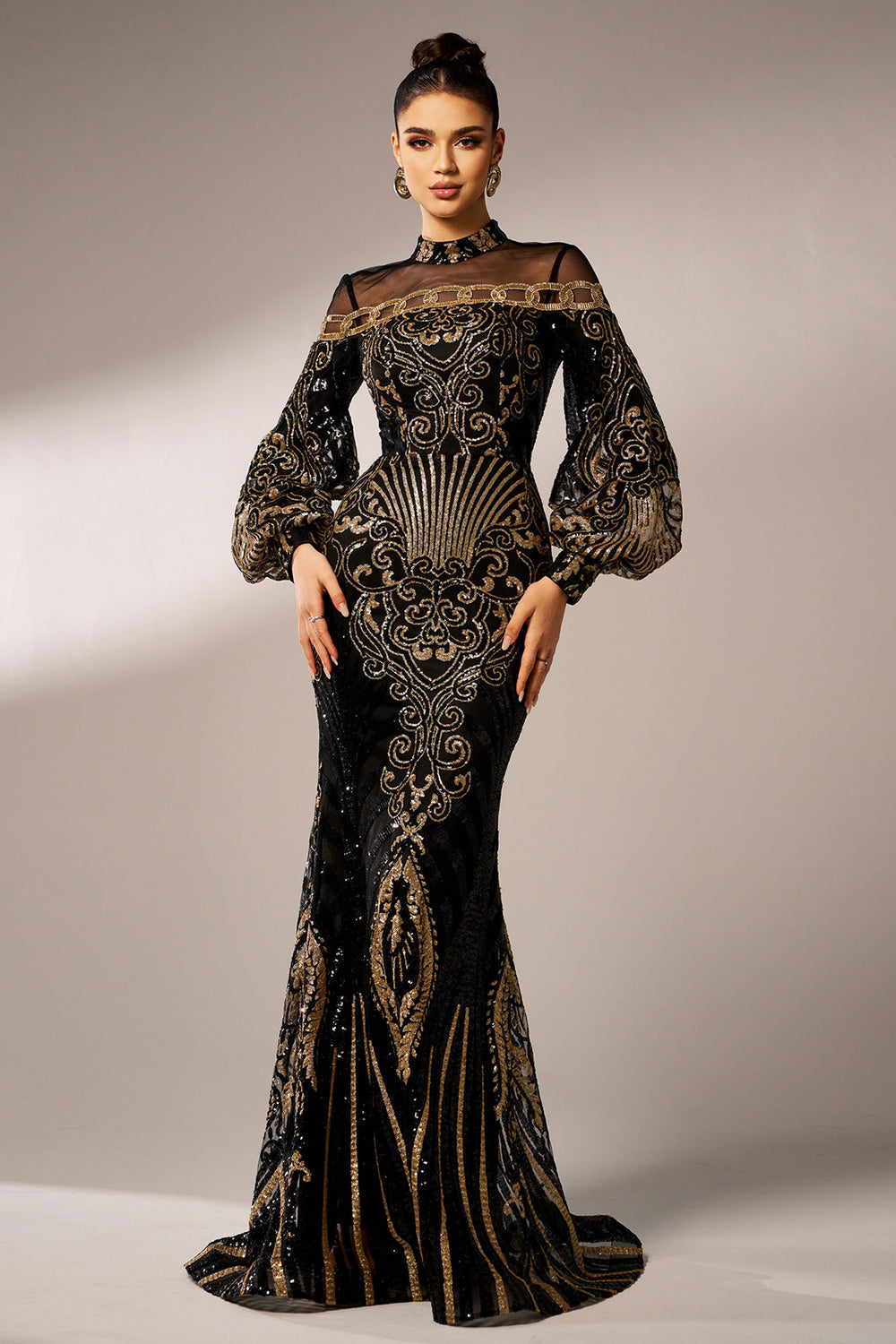 Glittrande sjöjungfru Långärmad Hög hals Paljetter Lång balklänning
