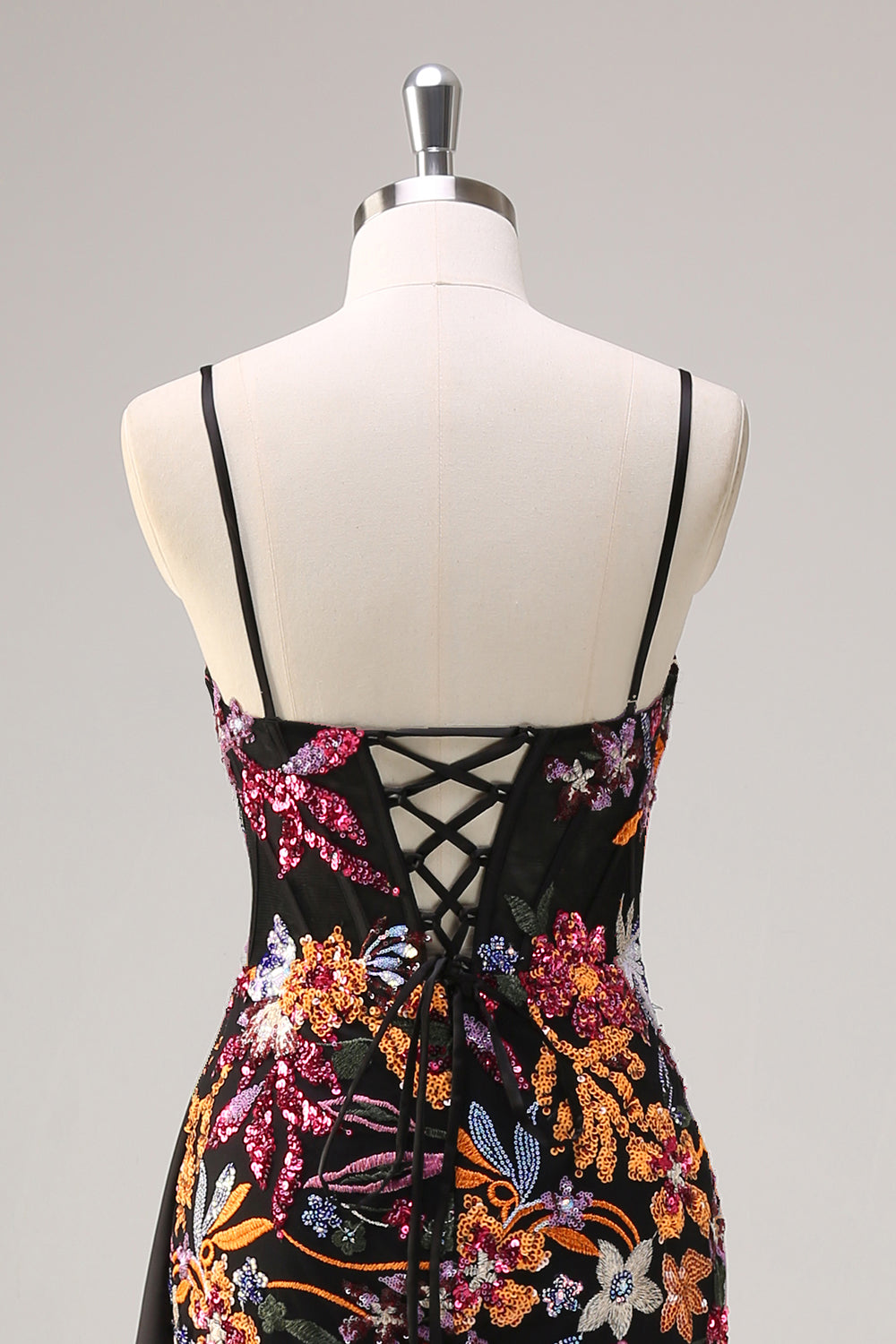 glittrande svart blommig sjöjungfru watteau släp paljetter lång korsett balklänning med slits