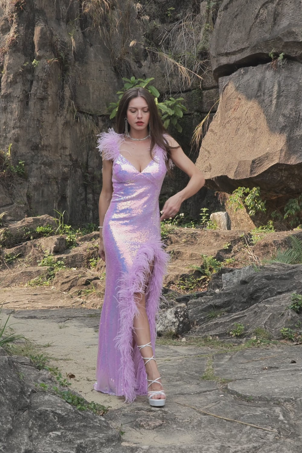 Mermaid Sweetheart Purple Paljetter Lång balklänning med fjäder