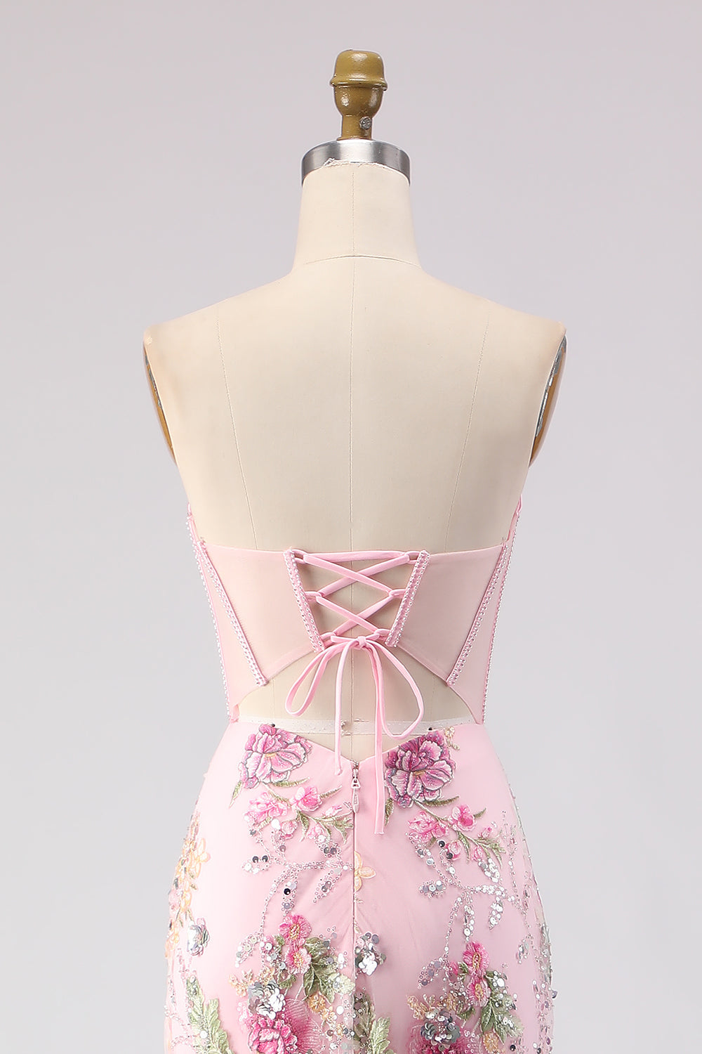 Rosa axelbandslös sjöjungfrukorsett med paljetter lång balklänning med slits