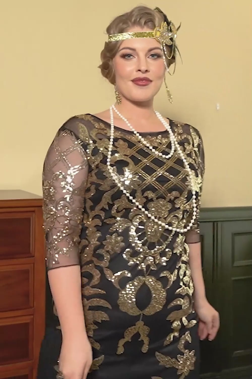 Svart Gyllene Plus Size 20 Tals Paljettklänning