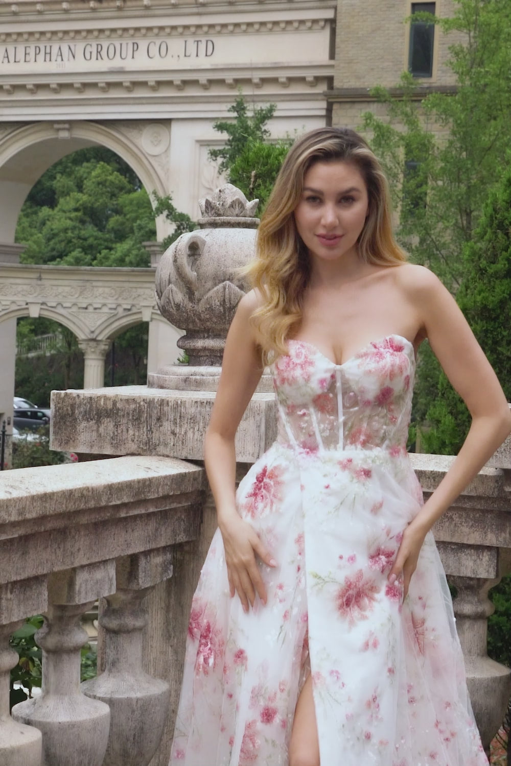 Elfenbensblomma broderad lång korsett balklänning med slits
