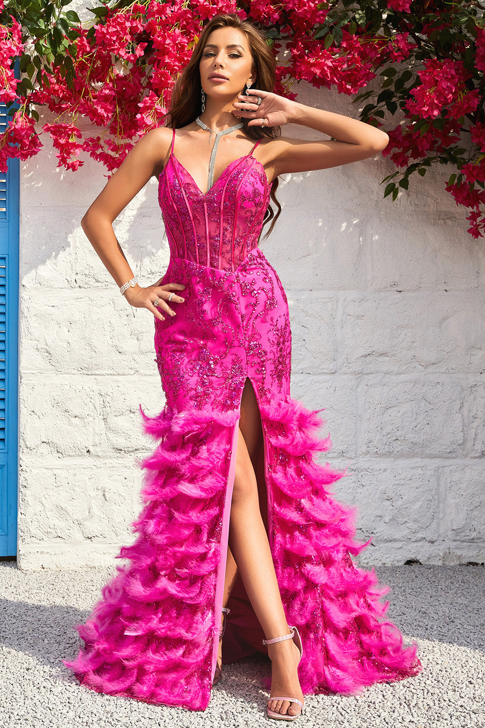 Fuchsia Sjöjungfru Spaghettiband Lång Balklänning med Fjädrar