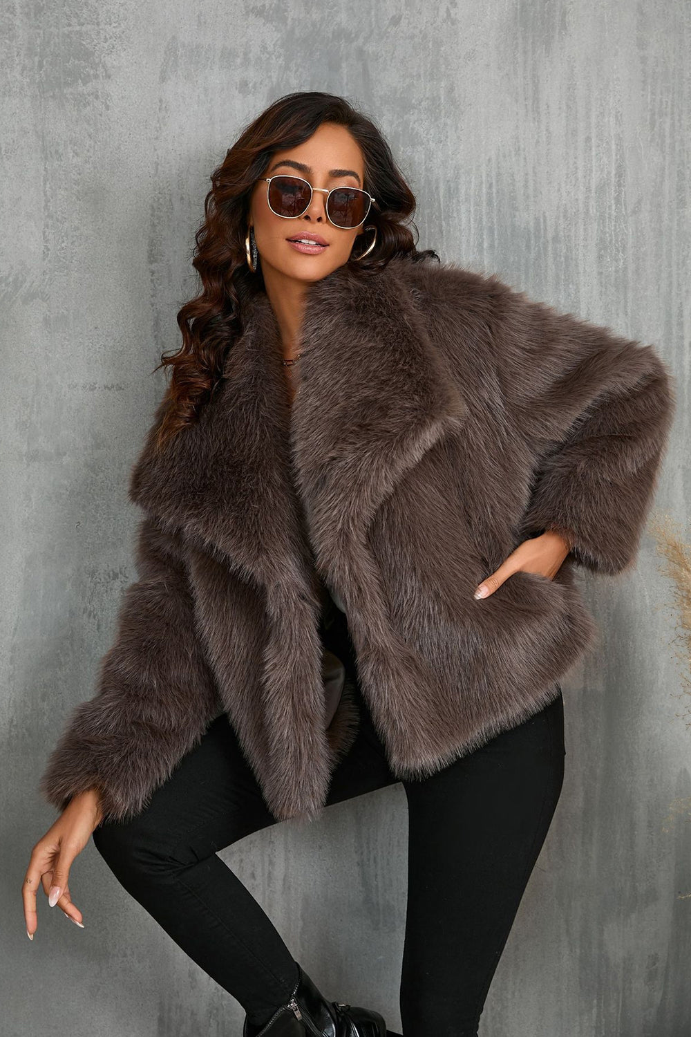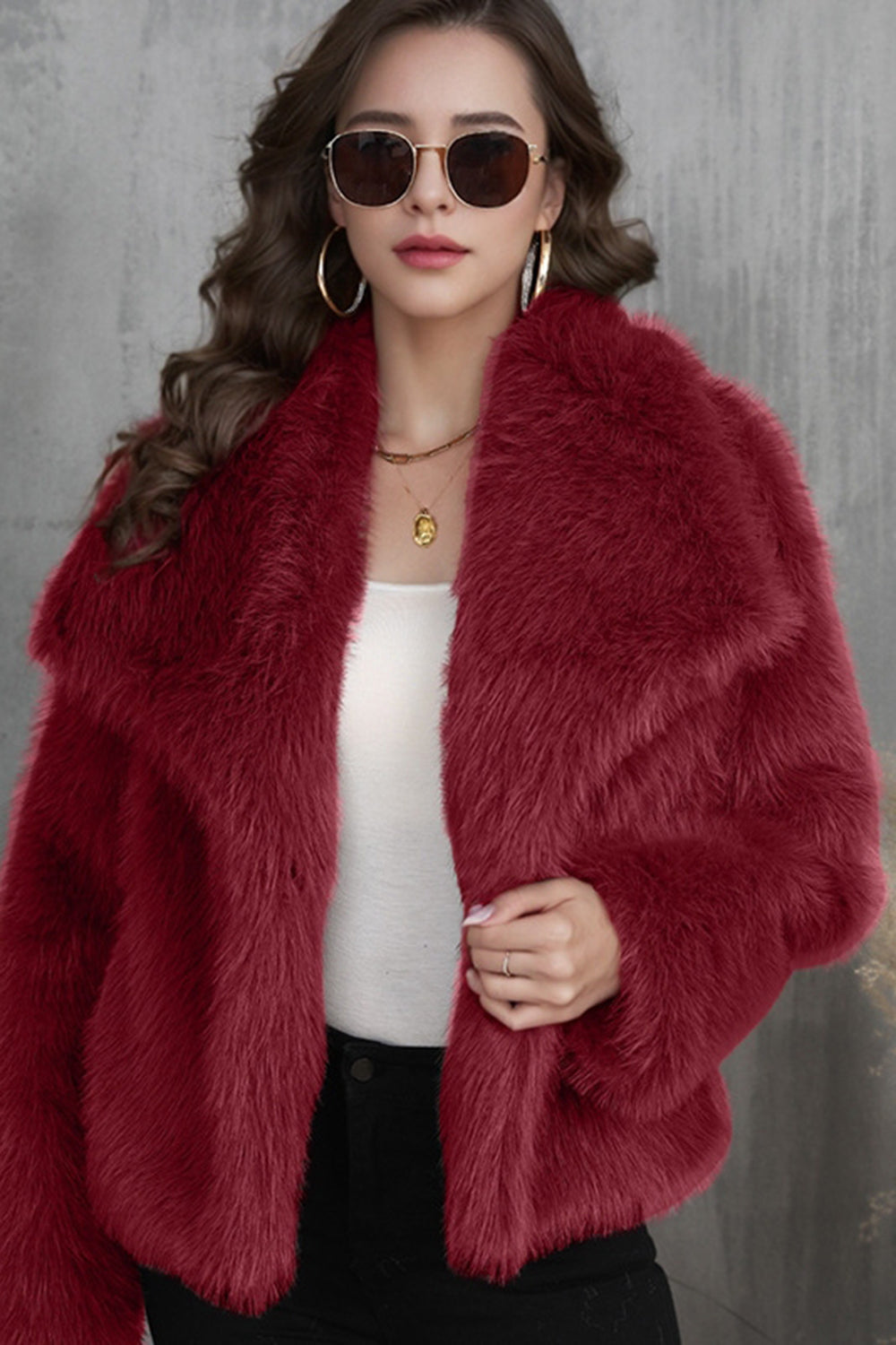 Fluffig Svart Vänd Kavajslag Fuskpäls Vinter Kappa