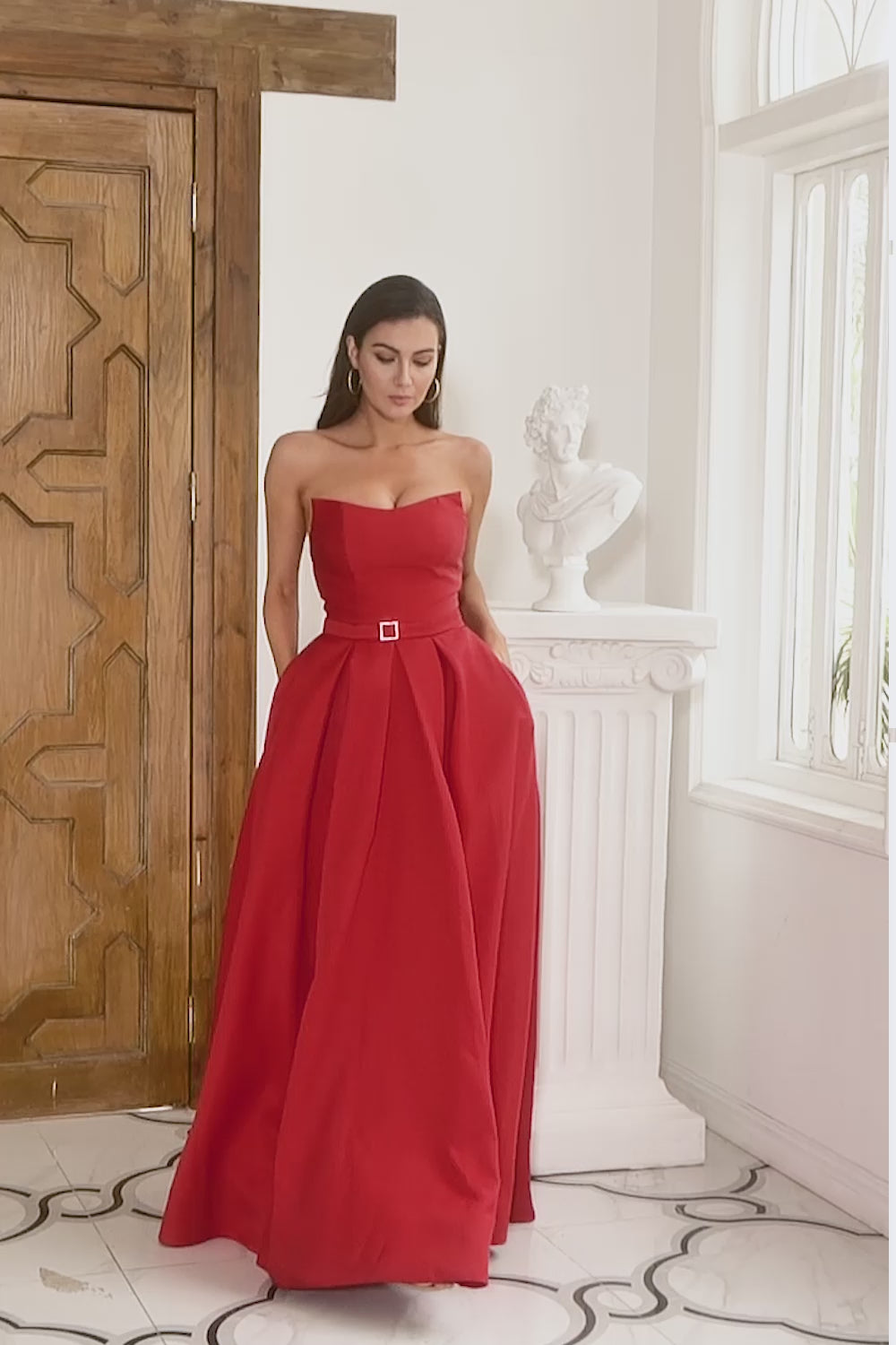 A-linje Axelbandslös röd lång Balklänning med delad front