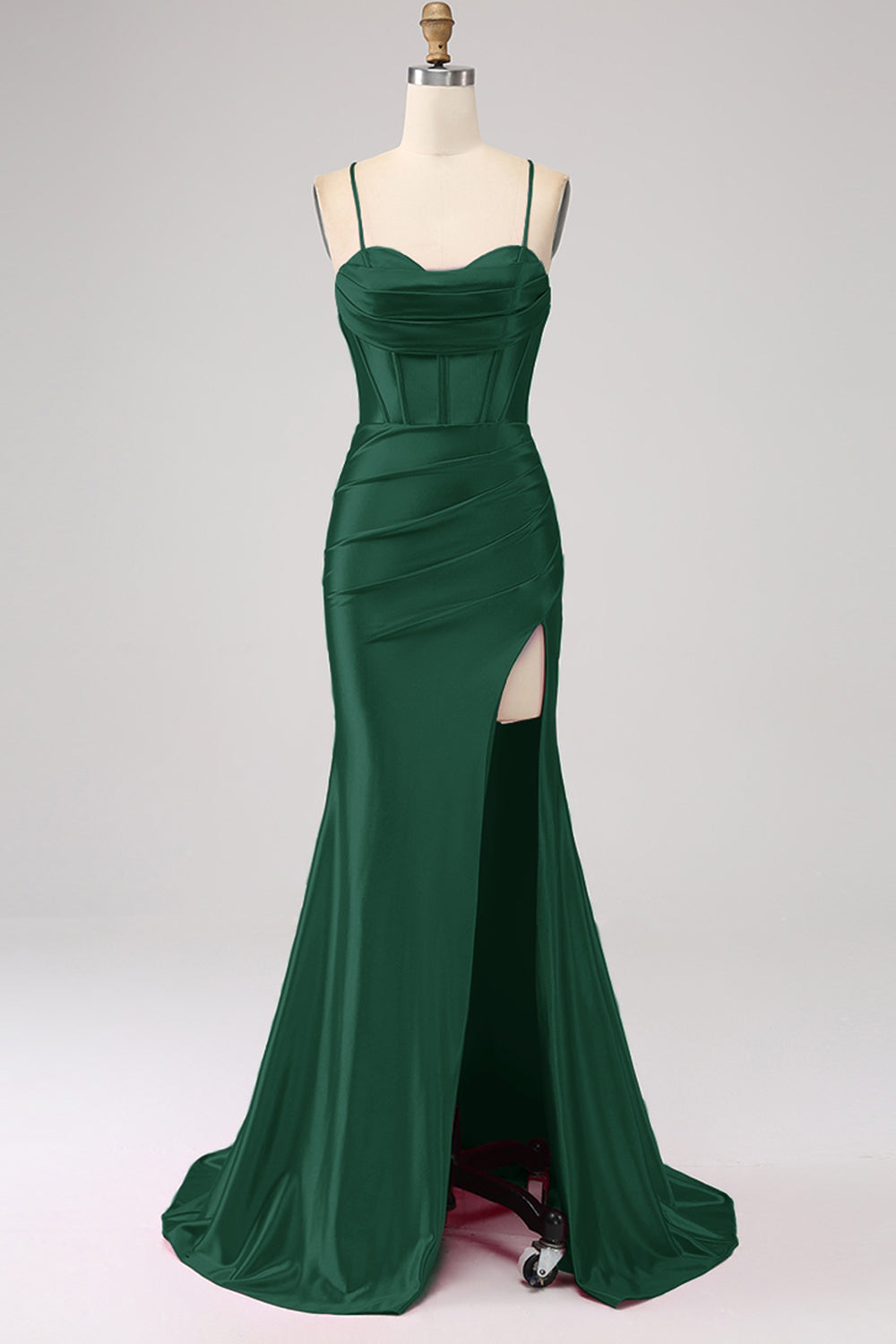 Fantastisk Röd Sjöjungfru Spaghetti Straps Korsett Balklänning Med Delad Framsida