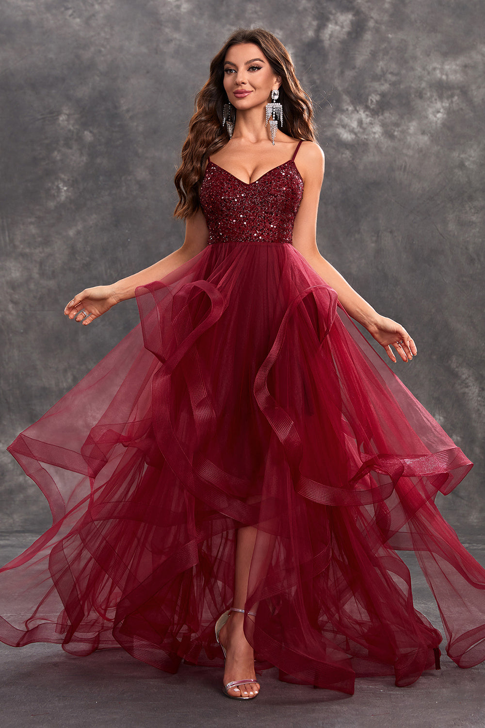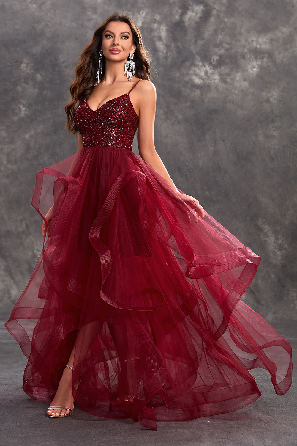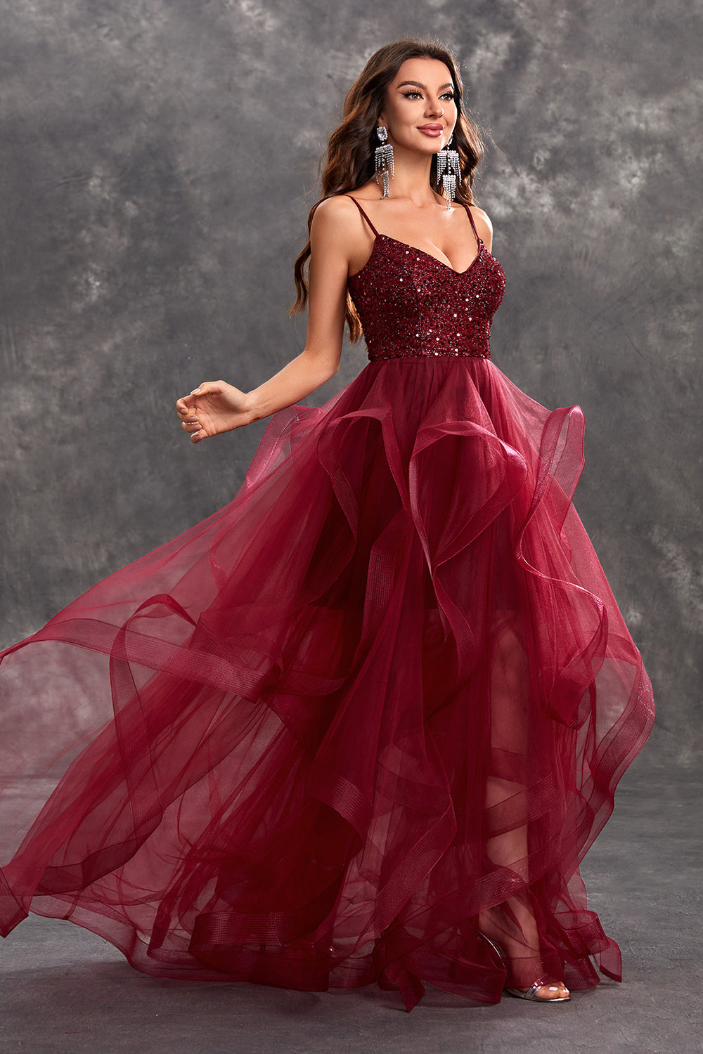 Glittrande vinröd A-linje volang Tiered Lång Balklänning med paljetter