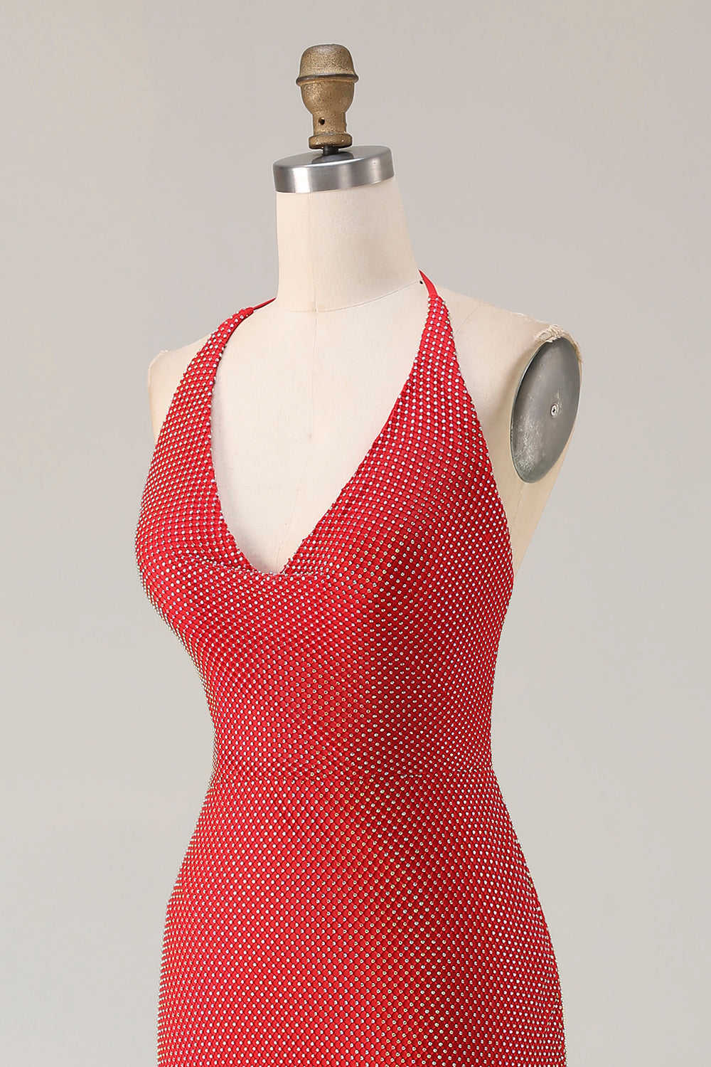 Röd halterneck-pärlprydd sjöjungfruklänning med slits