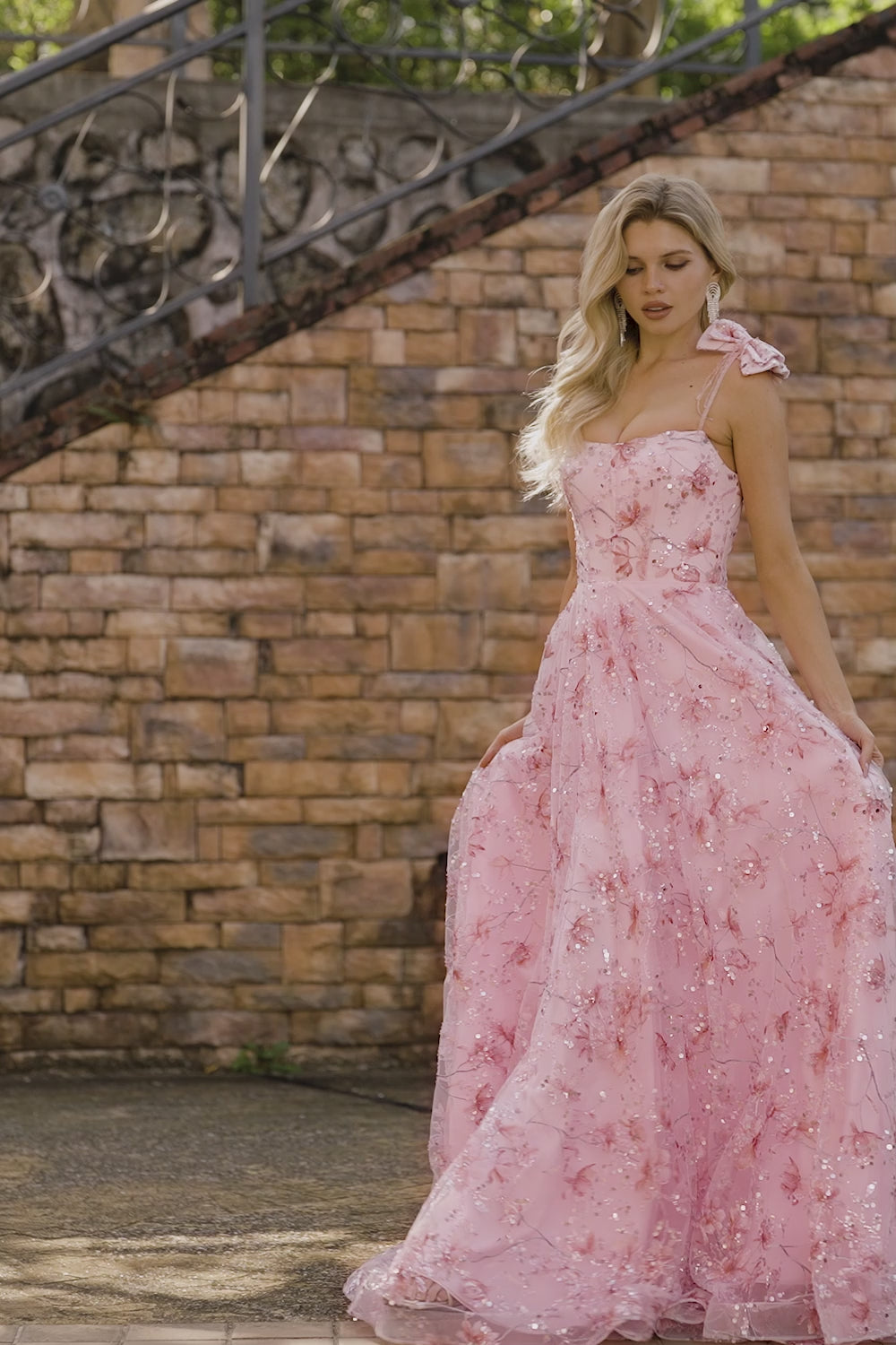 Glittrig Rosa A-linje Blompaljetter Lång Balklänning med Rosetter