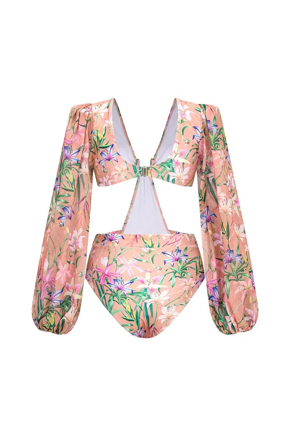 Rosa blommiga långärmade tvådelade baddräkt med volang och strandklänning