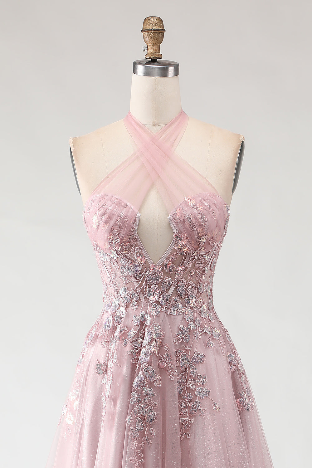 Rougerosa halterneckkorsett applikerad En lång balklänning med slits