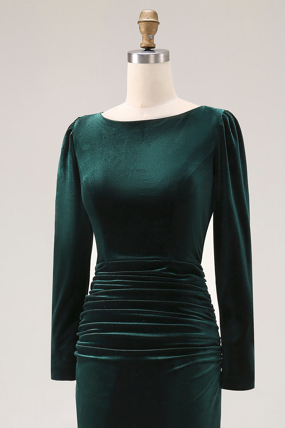 Mörkgrön sammetsklänning med rynkad midi-arbetsklänning med långa ärmar