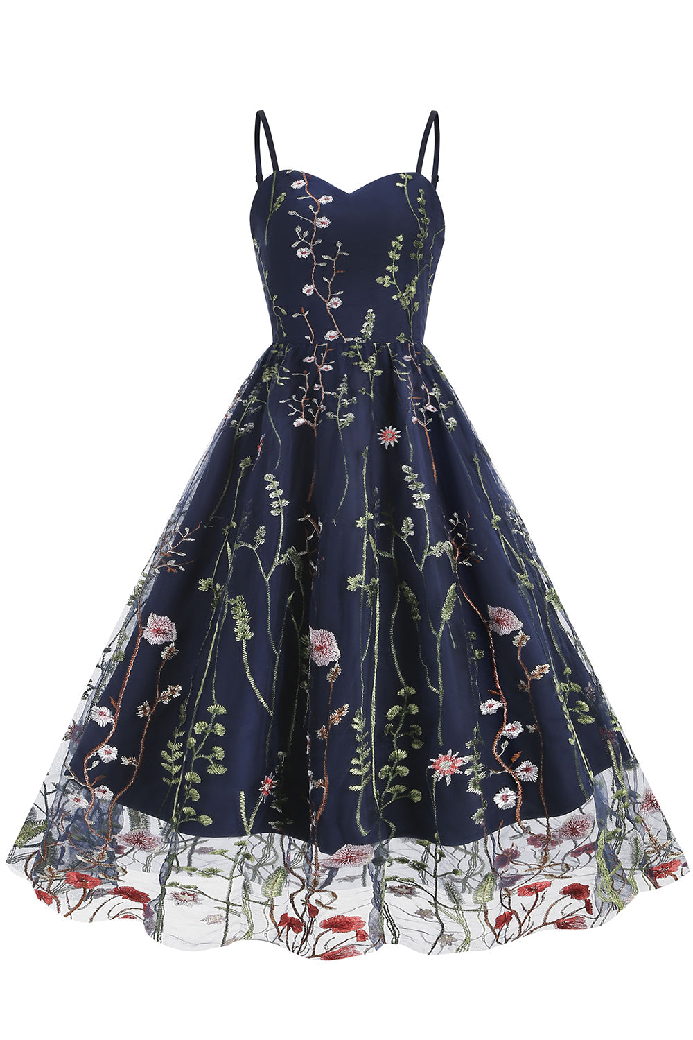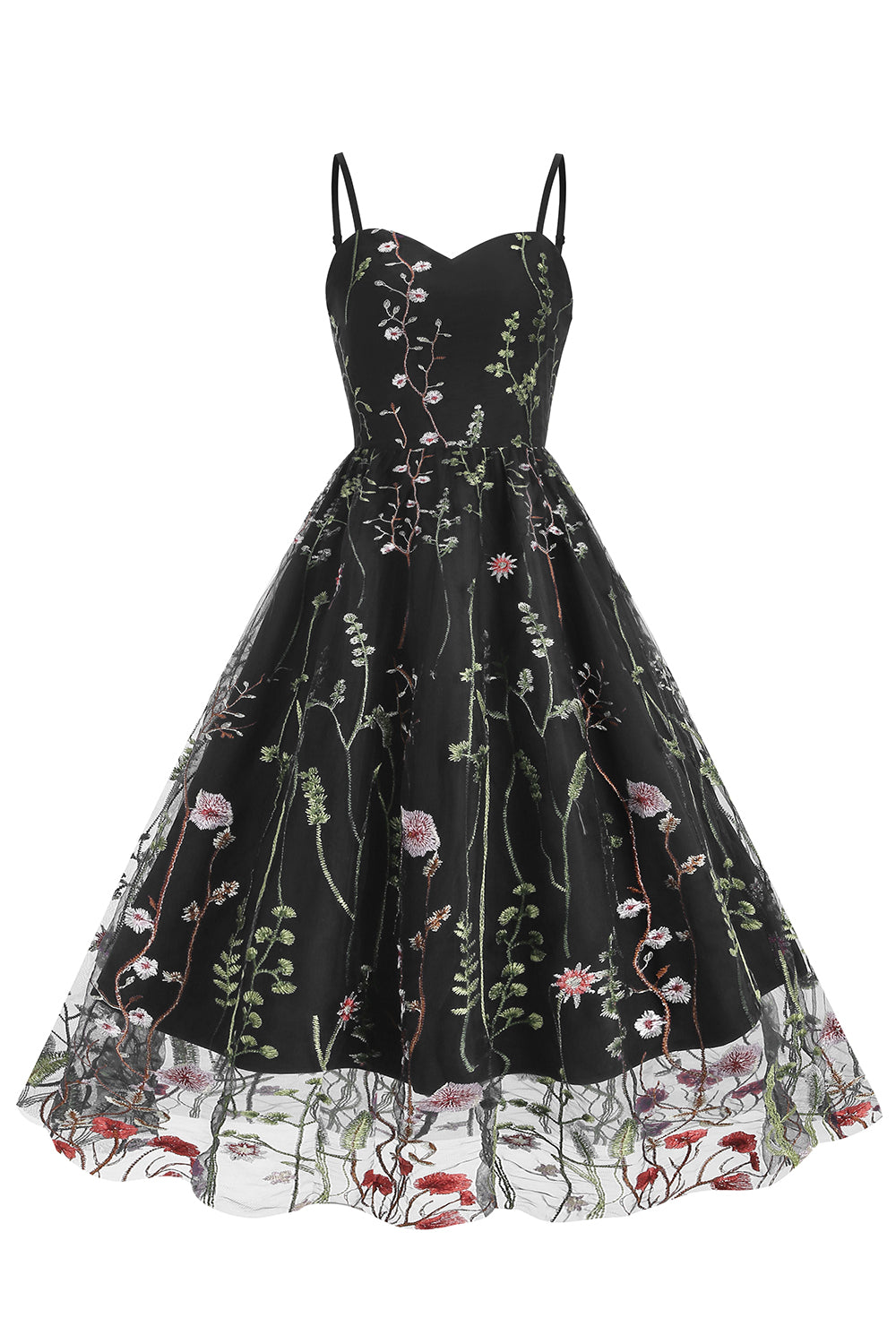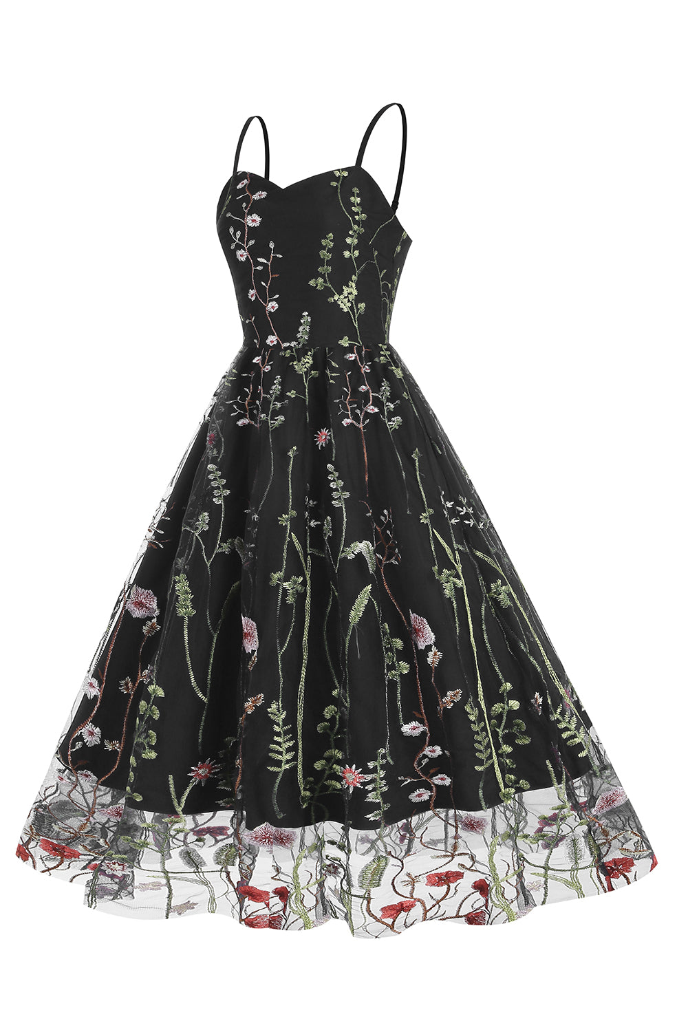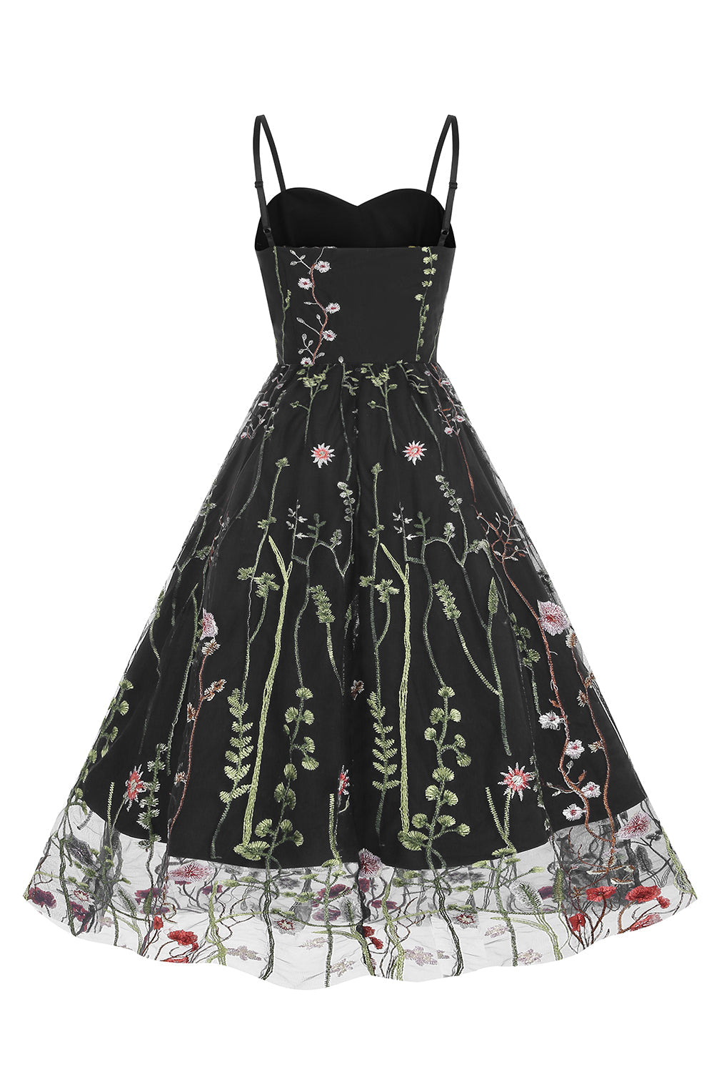 Svart Spaghettiband En Linje 1950-Tals Vintage Klänning med Broderi