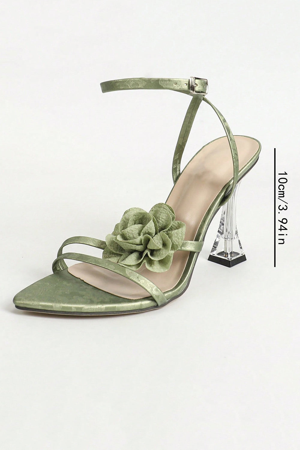 Grön fotledsrem med öppen tå transparenta högklackade skor med 3D-blomma