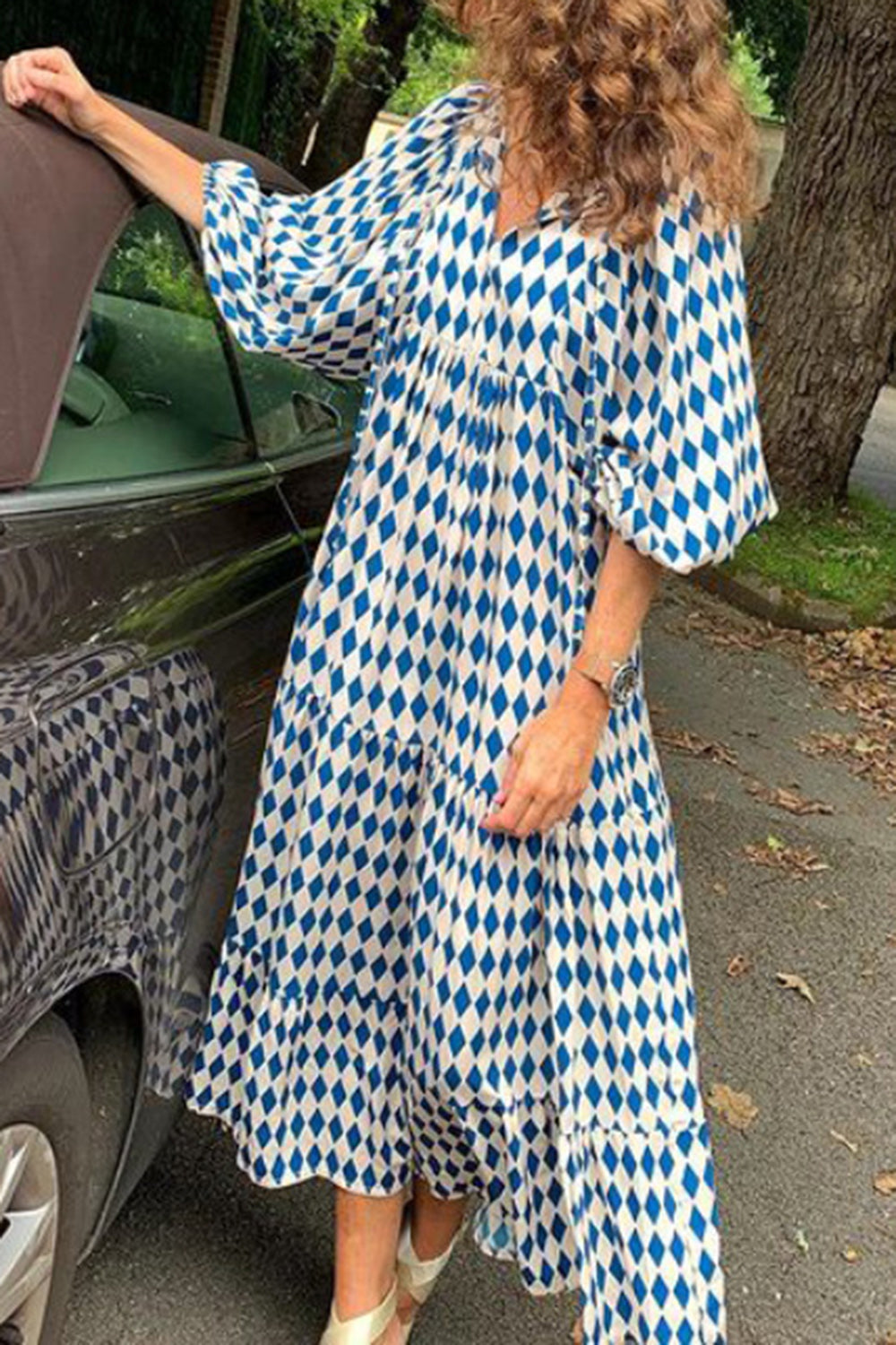 Blå tryckt Boho Puff Sleeve Lös Lång Klänning