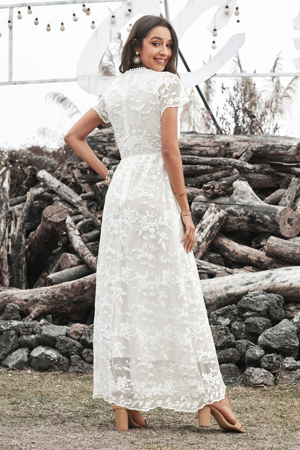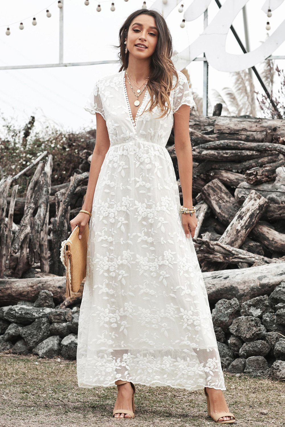 V-ringad vit spets bröllopsfestklänning