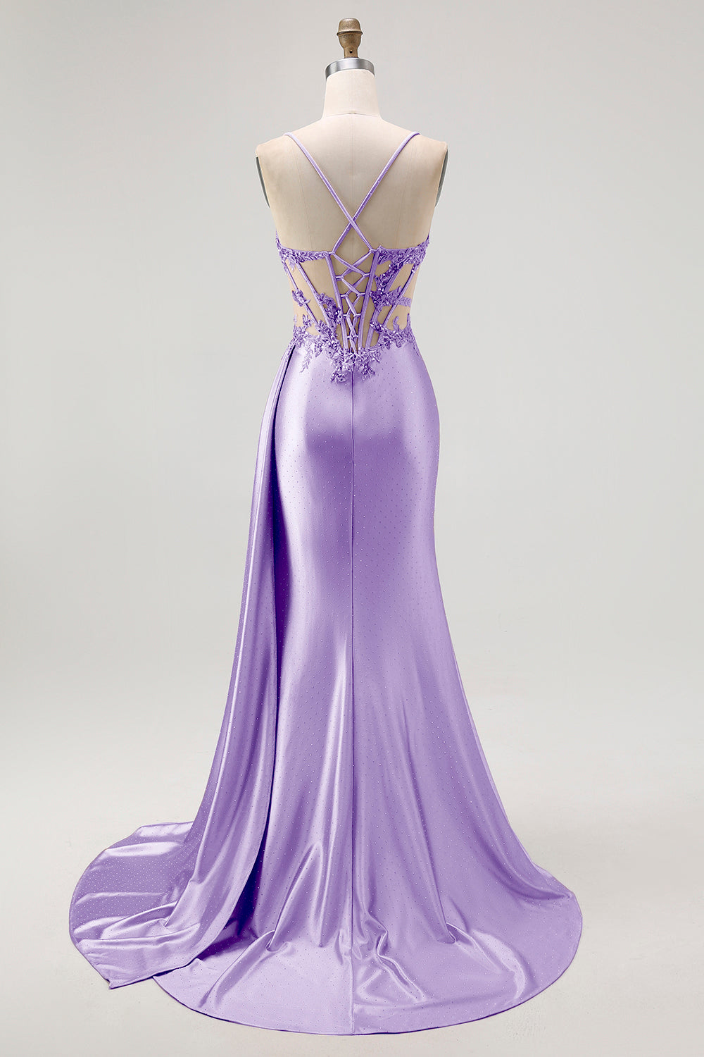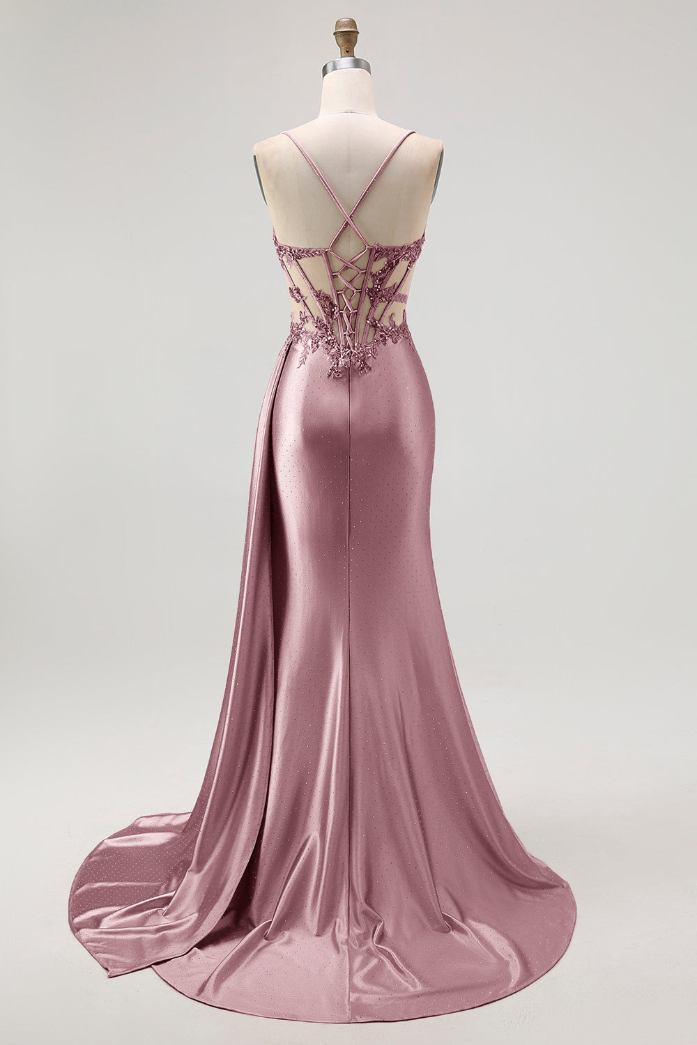 Rouge sjöjungfrugenomskinlig korsett med axelbandslös lång balklänning med slits
