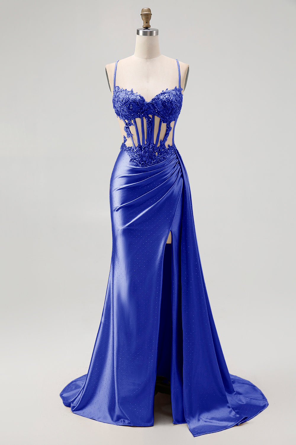 Champagne sjöjungfru genomskinlig korsett pärlbekantad sidoband, lång balklänning med slits