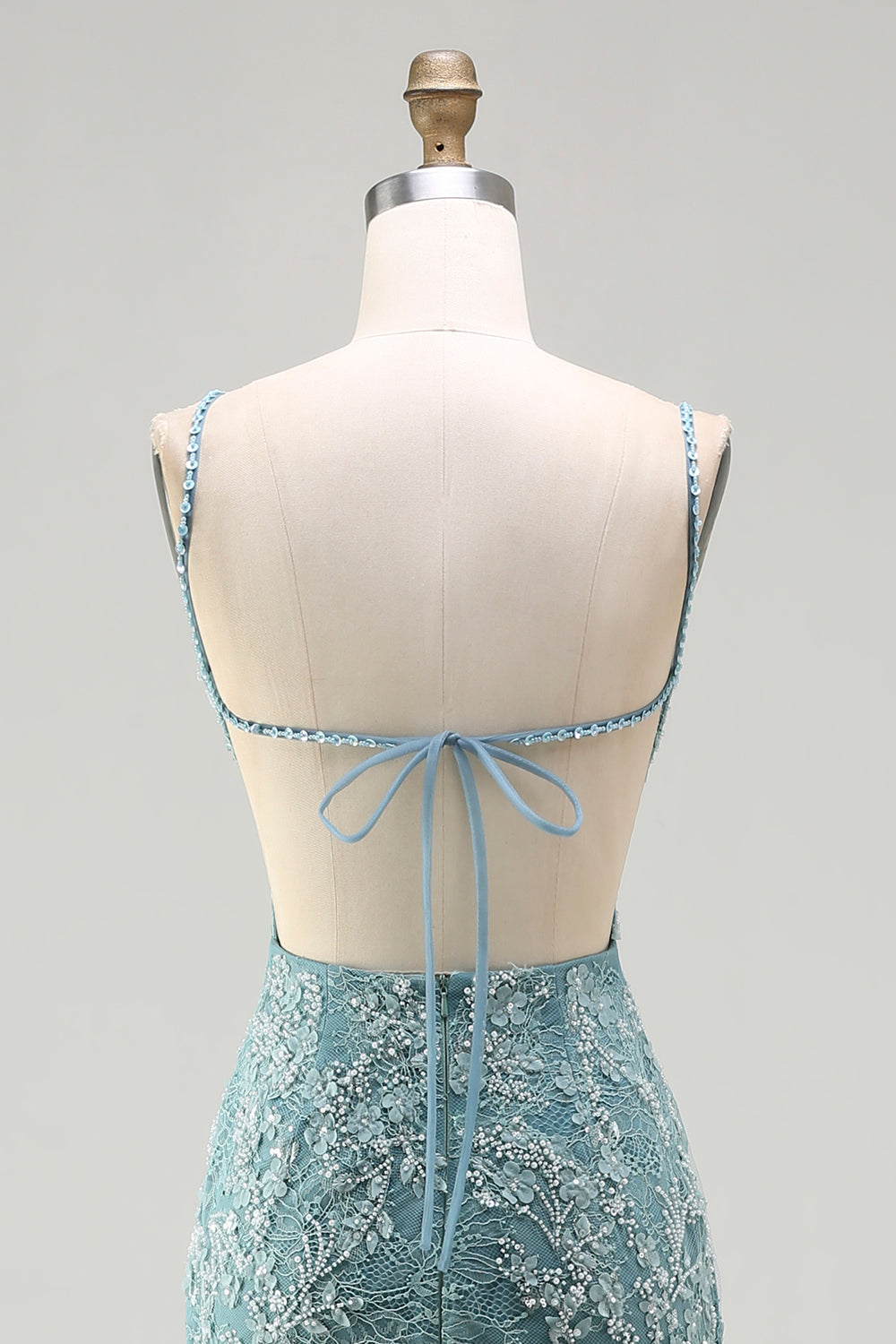Grågrön sjöjungfru pärlprydd rygglös applikationsklänning med lång balklänning med slits