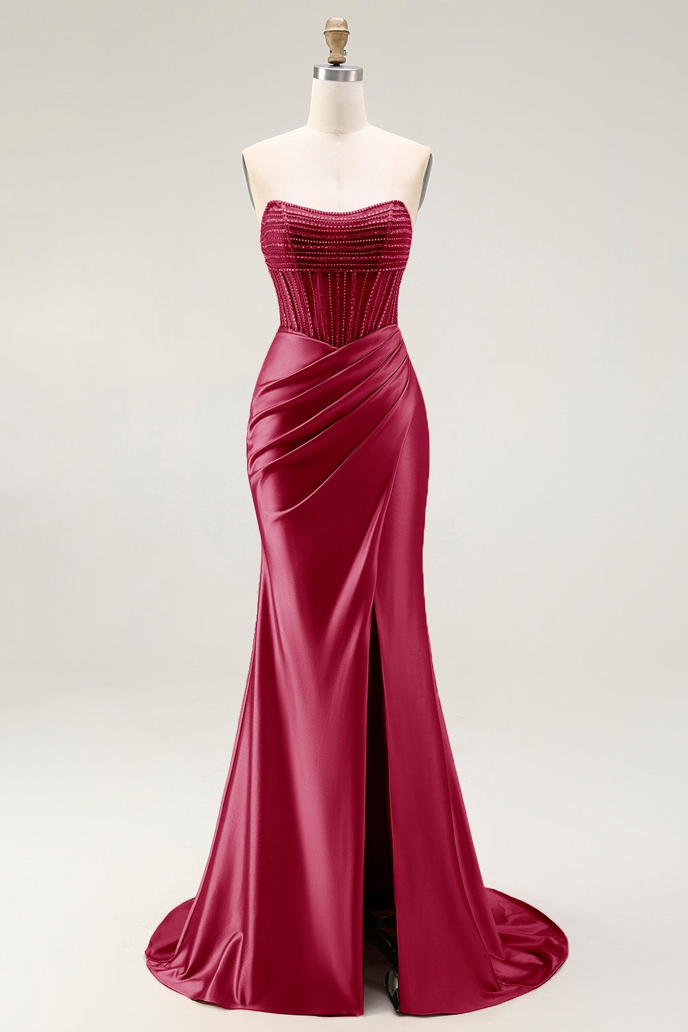 Rouge sjöjungfrugenomskinlig korsett med axelbandslös lång balklänning med slits