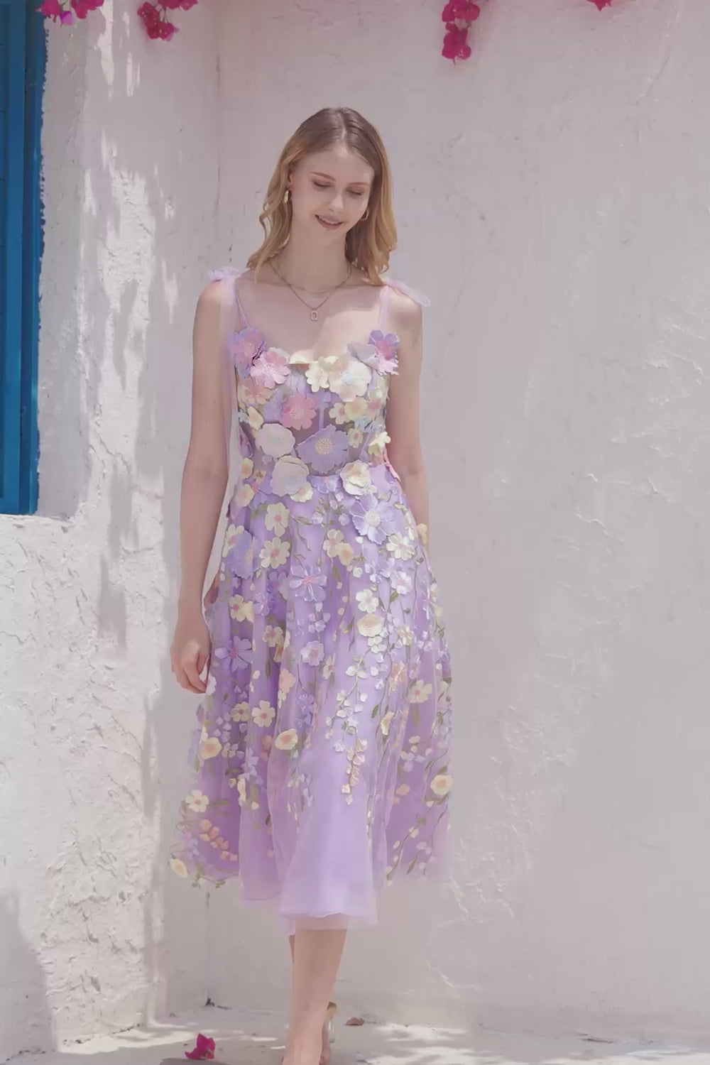 A Linje Spaghettiband Lila Te Längd Balklänning med 3D-blommor