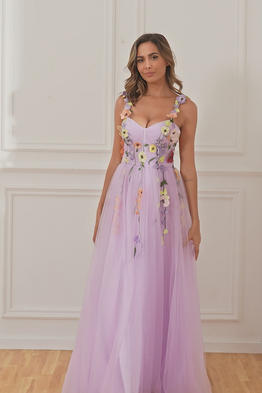 Lila En Linje Spaghettiband Balklänning Med 3D-Blommor