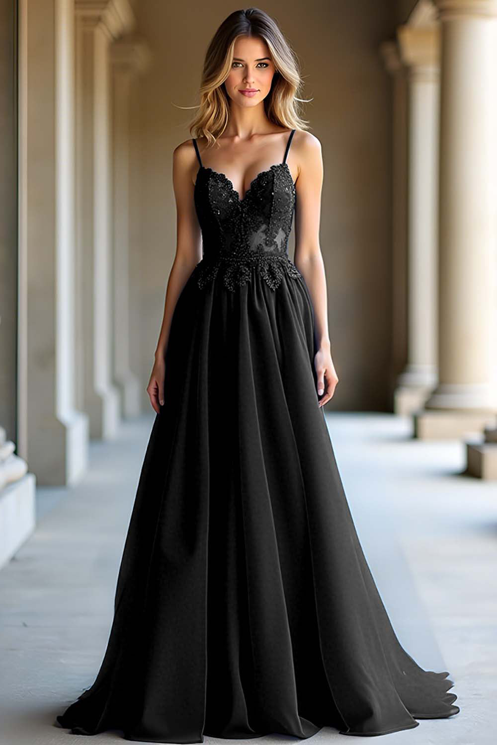 En linje mörkblå spaghetti remmar älskling lång balklänning