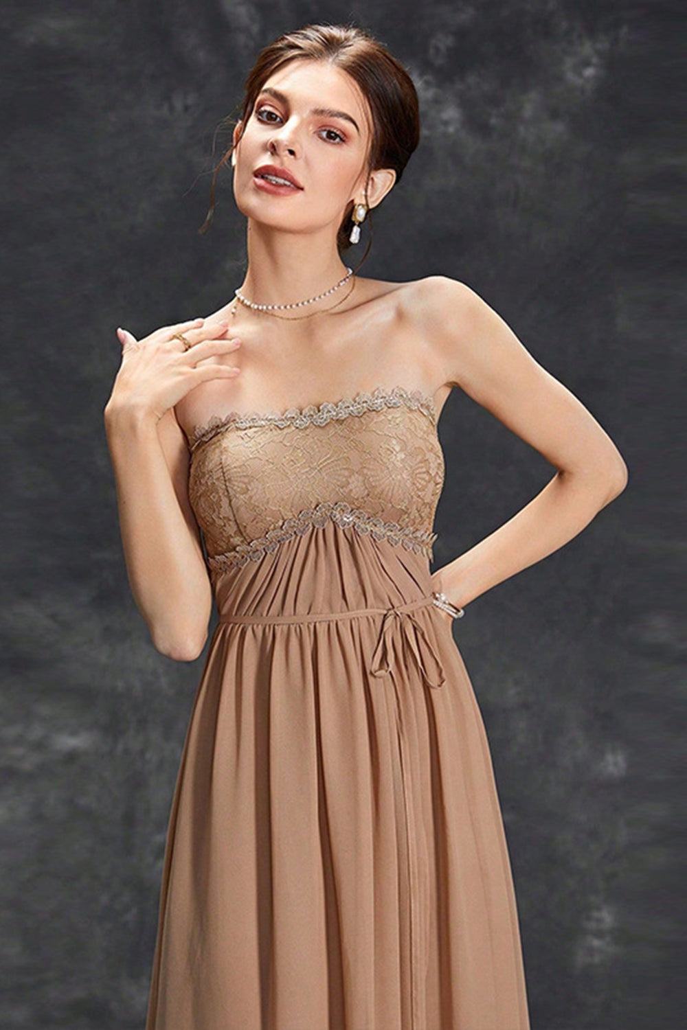 Enkel Khaki A-linje axelbandslös chiffong lång balklänning