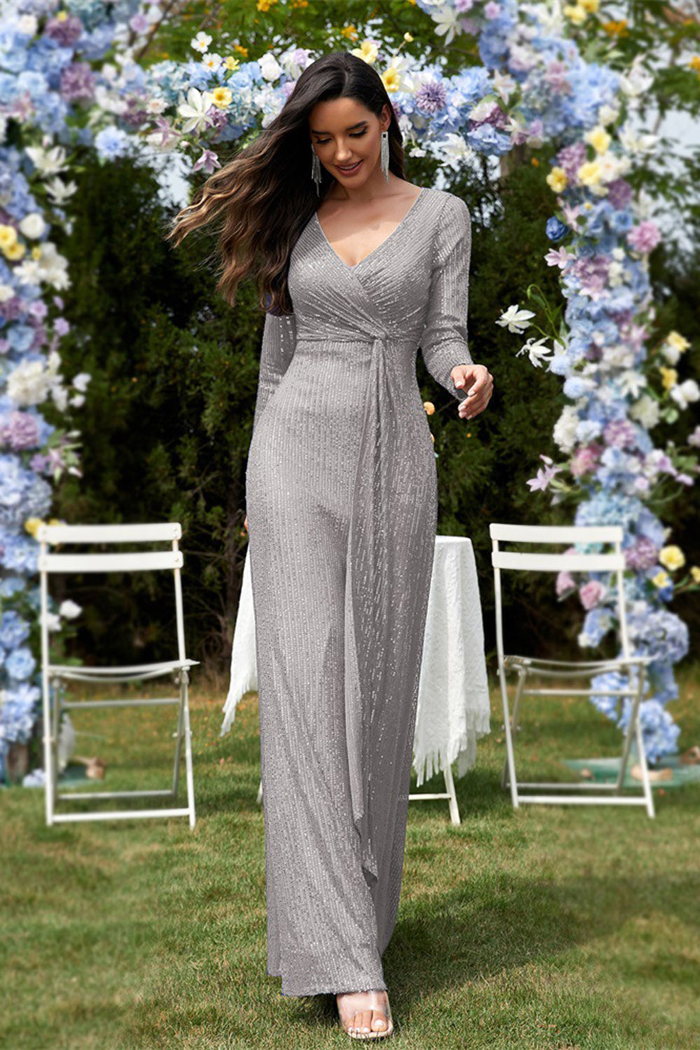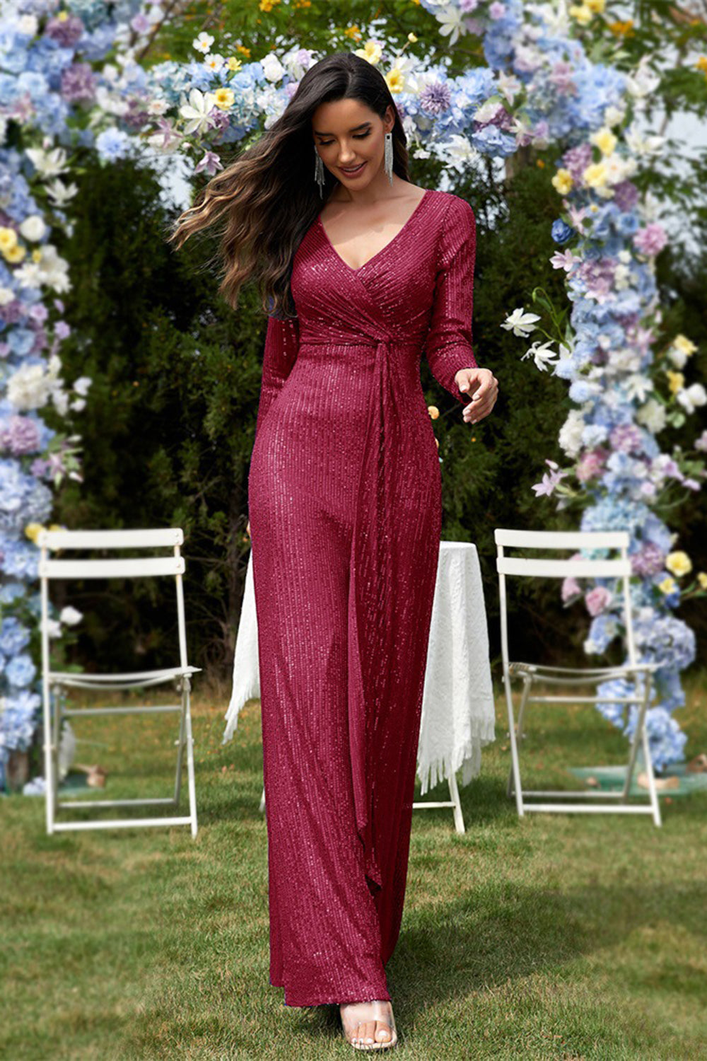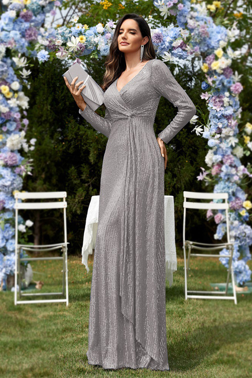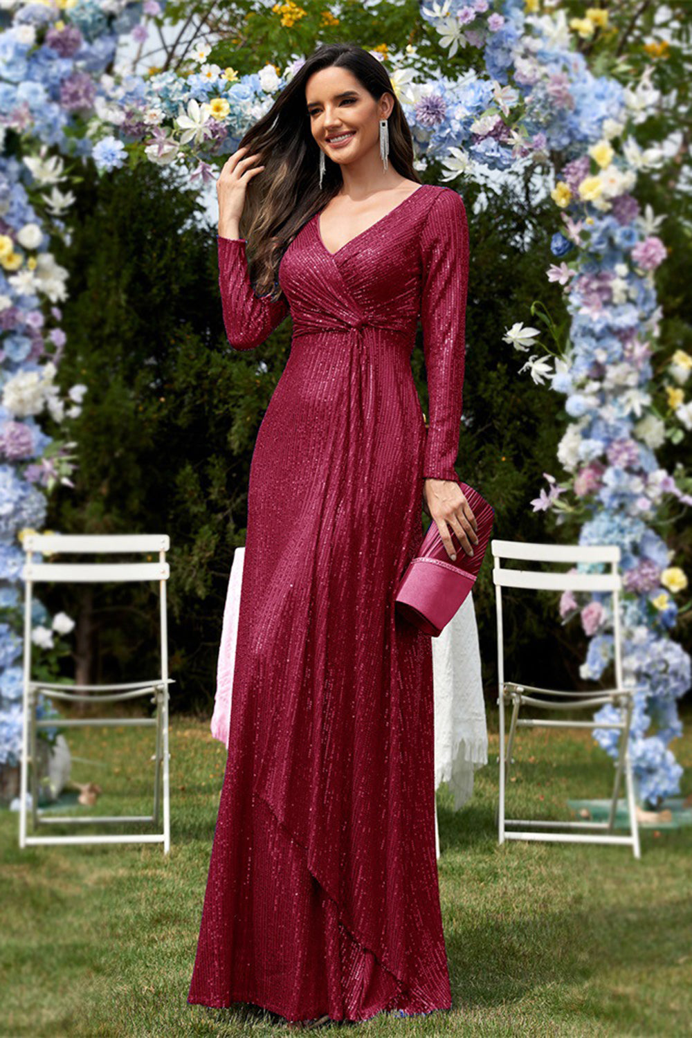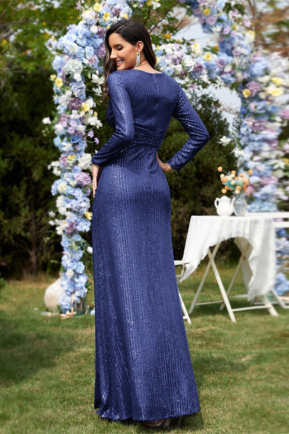 Glitter Royal Blue Pärlor V-hals Långärmad Plisserad Fodral Klänning till brudens mor