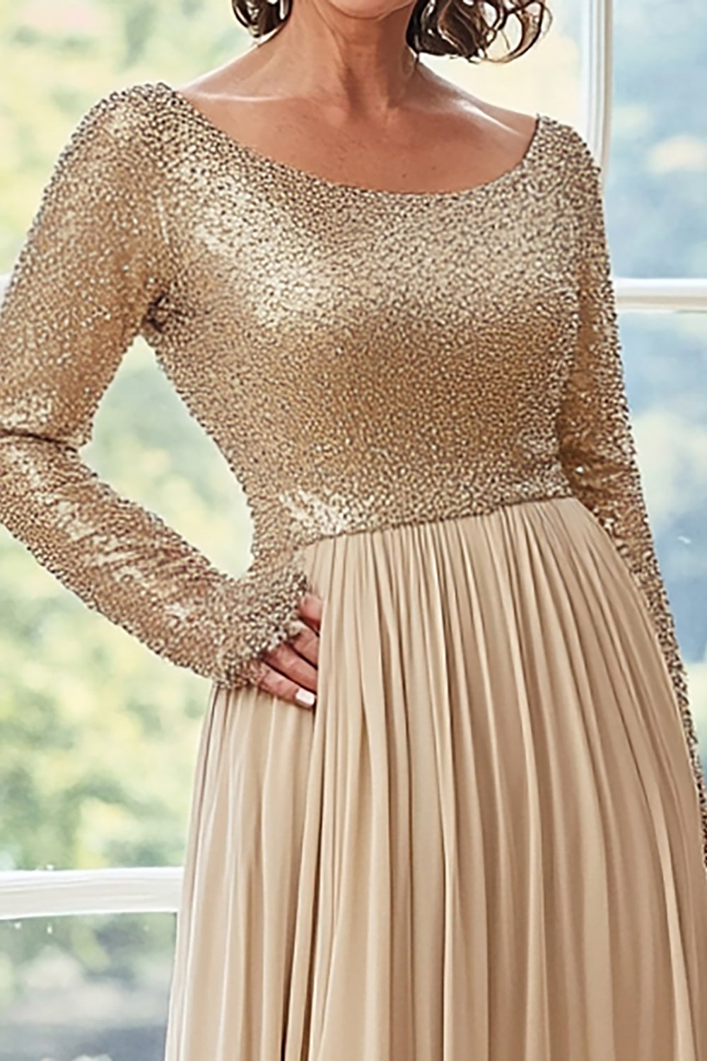 Gyllene A Line Chiffong Plisserad Klänning för Brudens Mor med Långa ärmar