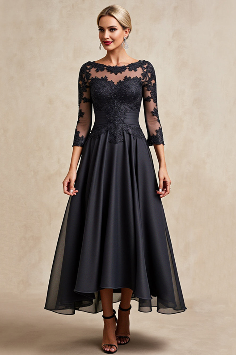 Svart A Line 3/4 ärm Telängd Klänning till brudens mor med applikationer