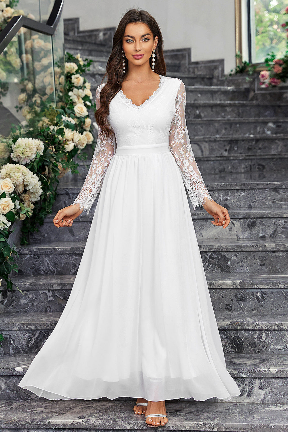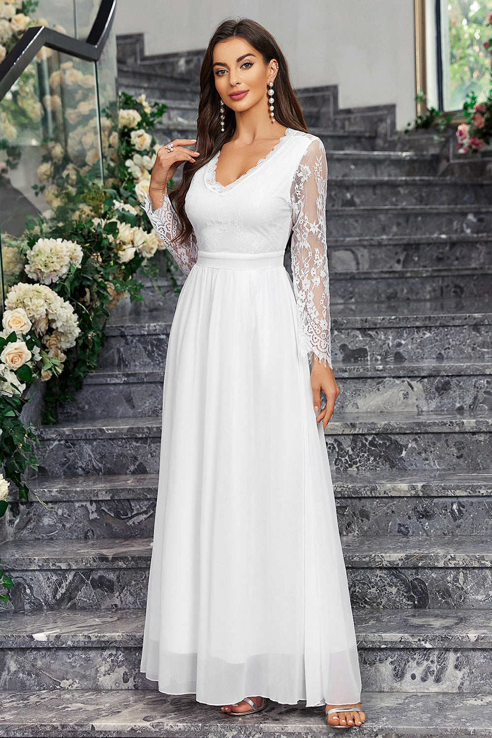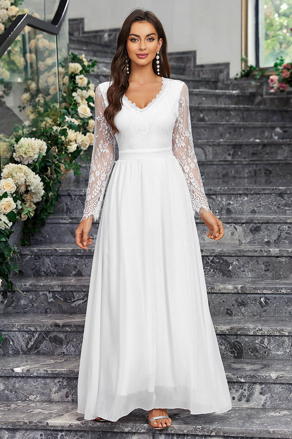 A-linje Långärmad V-hals Lång Vit Klänning