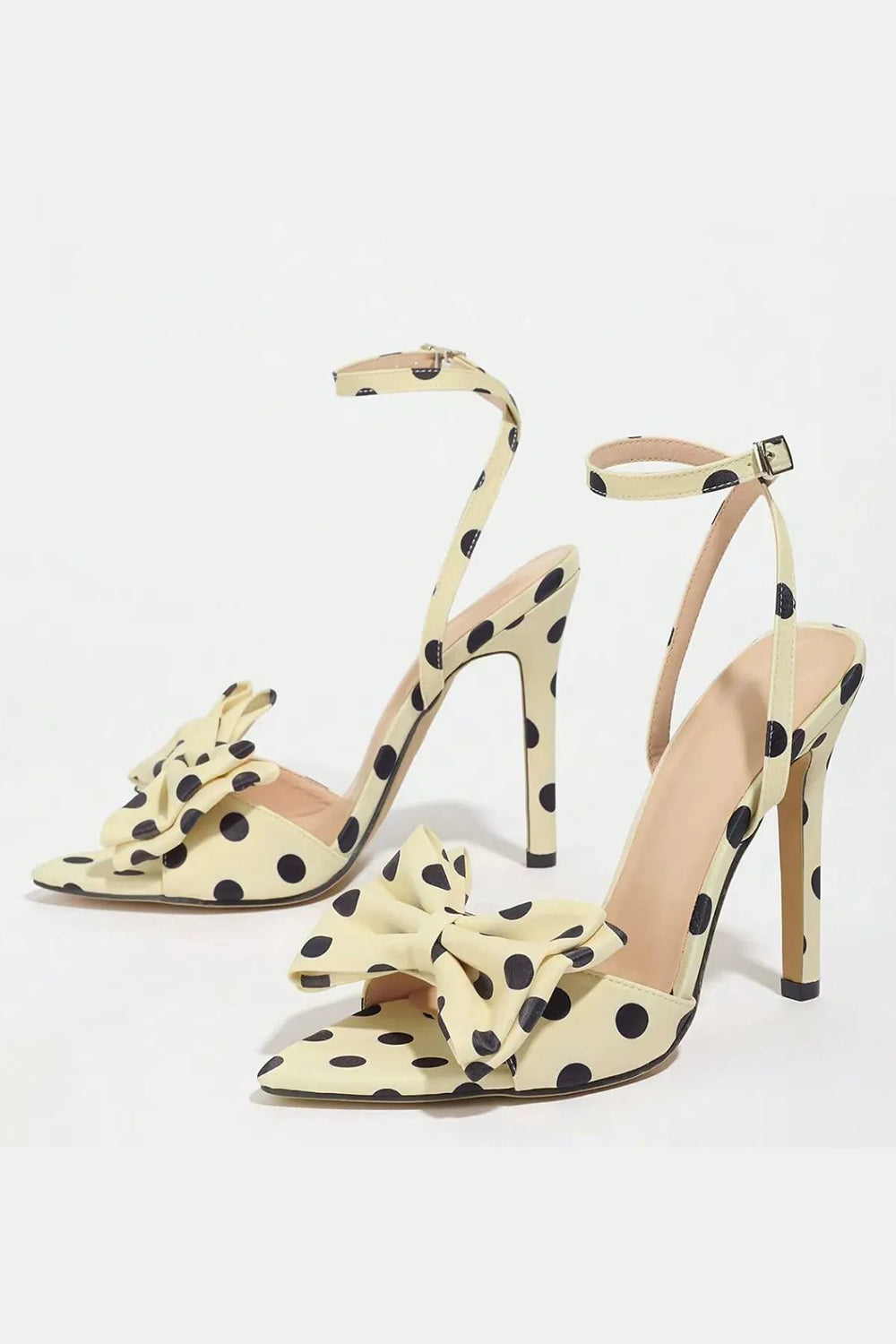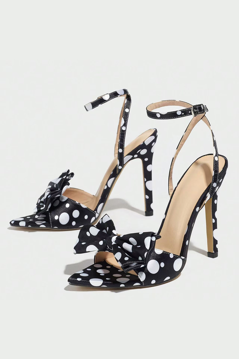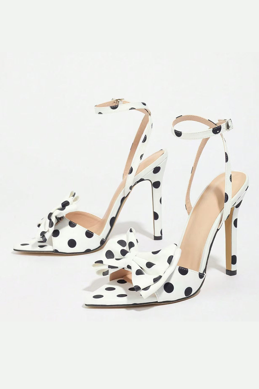 Vita svarta prickiga stilettklackar med öppna tåar och höga klackar med rosett