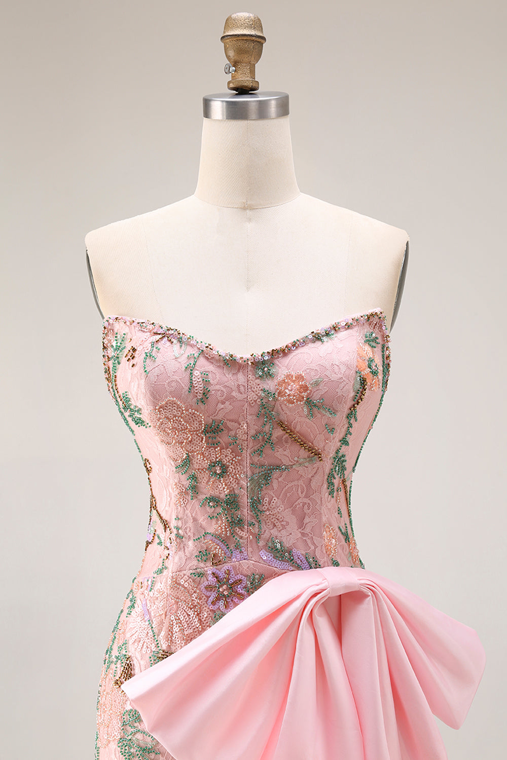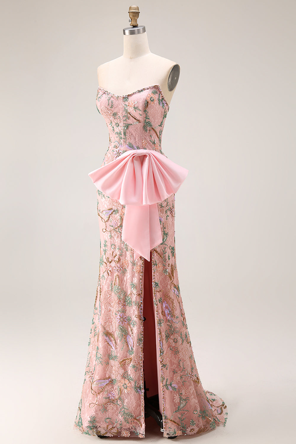Axelbandslös paljettprydd blommig lång balklänning med rosett på höften och kjolslits