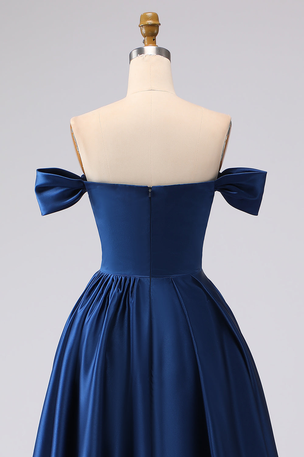 Axellös marinblå satin A-linje lång balklänning med slits