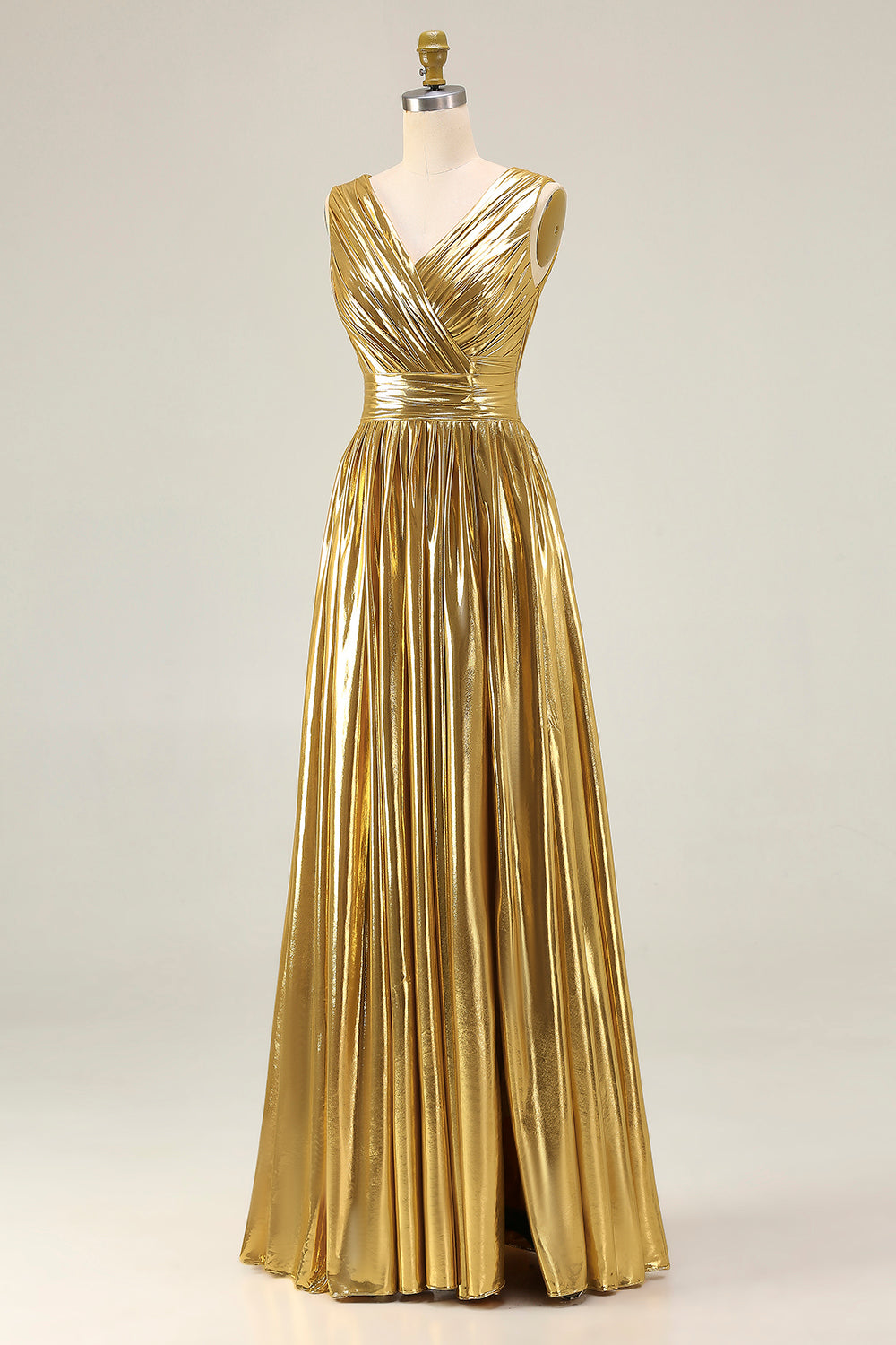 Metallisk guld V-ringad A-linje lång formell klänning med slits